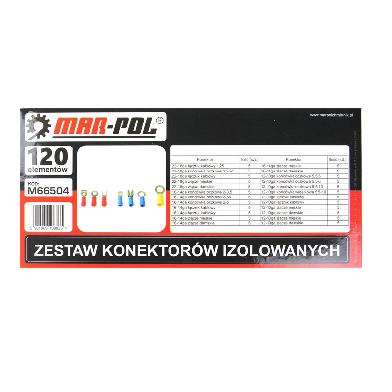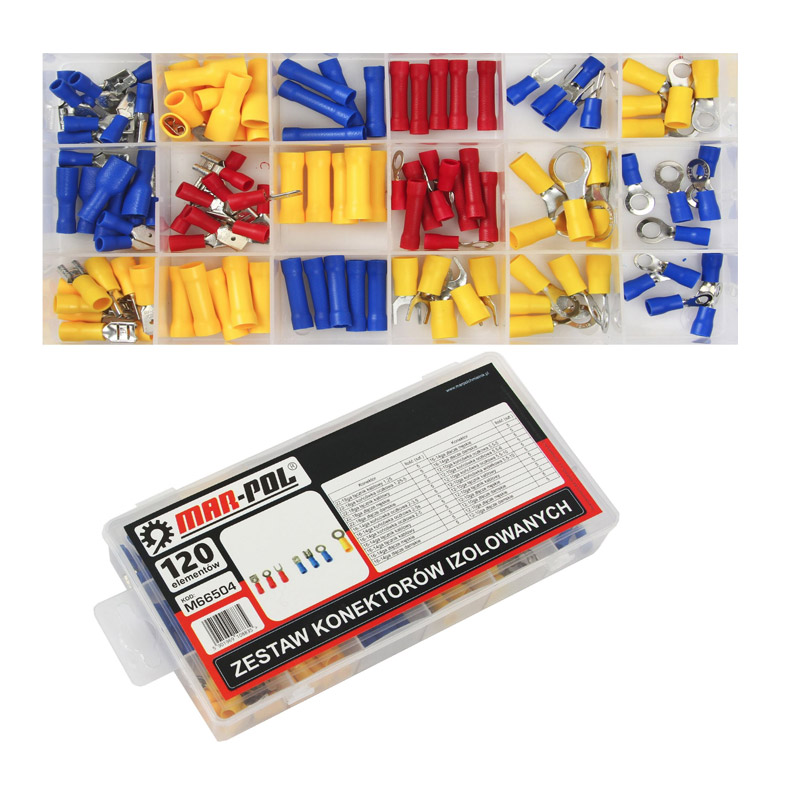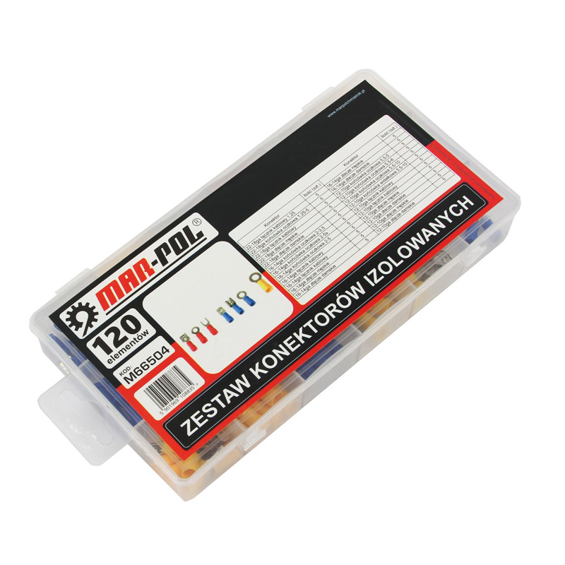 Το σετ, από την εταιρία MAR-POL, αποτελείται από ακροδέκτες καλωδίων με μόνωση, οι οποίοι συνοδεύονται από πρακτική κασετίνα αποθήκευσης και μεταφοράς.