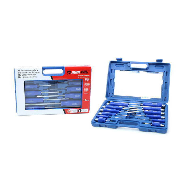 Το σετ, από την εταιρία MAR-POL, αποτελείται από 12 κατσαβίδια κατασκευασμένα από CrV με σκληρές μαγνητικές άκρες και ανθεκτικές λαβές.