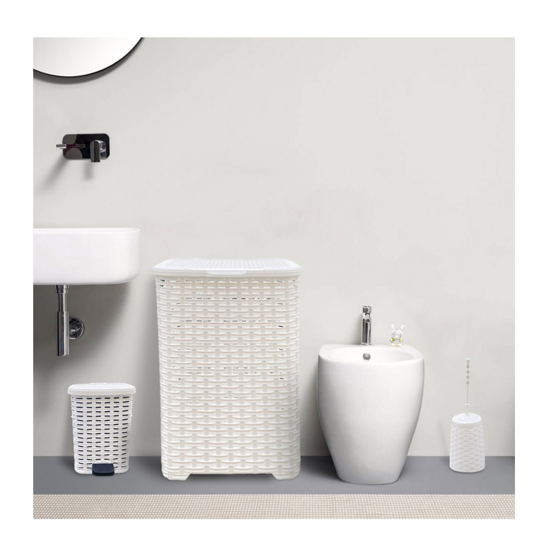 Το σετ μπάνιου, αποτελείται από ένα καλάθι για τα άπλυτα ρούχα με λαβές, ένα καλαθάκι απορριμμάτων με πεντάλ και ένα πιγκάλ. Κατασκευασμένα από πλαστικό με εφέ ρατάν.