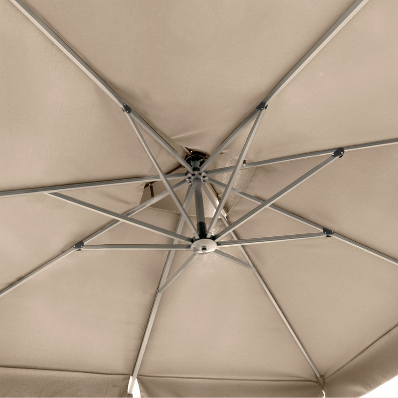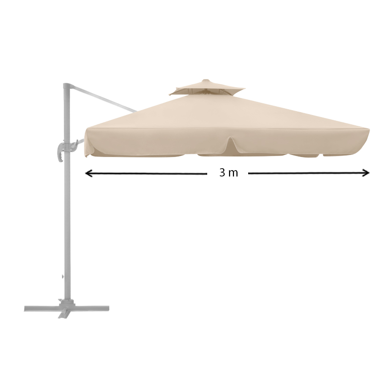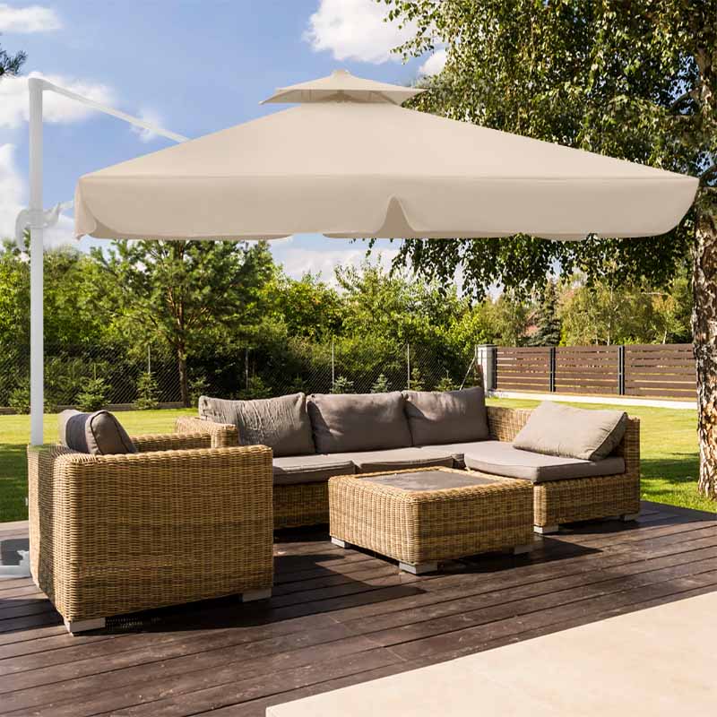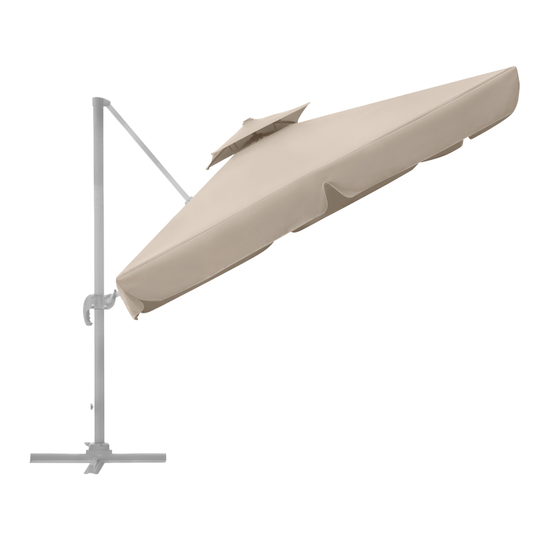 Τετράγωνη κρεμαστή ομπρέλα αλουμινίου με τηλεσκοπικό μηχανισμό και διπλό αεραγωγό που επιτρέπει την κυκλοφορία του αέρα μειώνοντας ταυτόχρονα την πίεση του. Ιδανική επιλογή για επαγγελματική χρήση όπως beach bars, πισίνες και χώρους εστίασης.