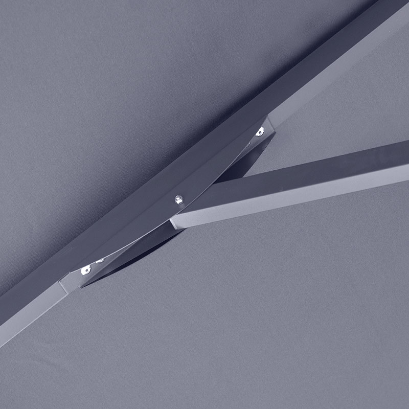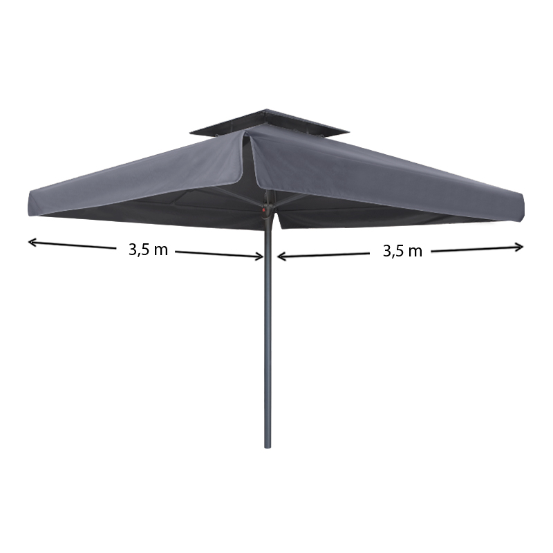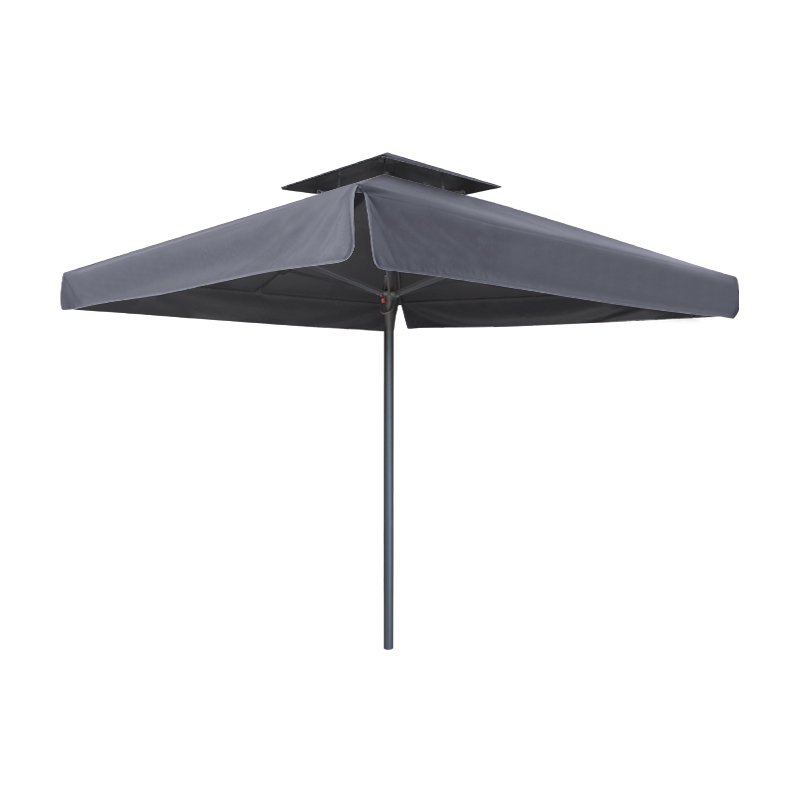 Τετράγωνη ομπρέλα αλουμινίου με τηλεσκοπικό μηχανισμό και διπλό αεραγωγό που επιτρέπει την κυκλοφορία του αέρα μειώνοντας ταυτόχρονα την πίεση του. Ιδανική επιλογή για επαγγελματική χρήση όπως beach bars, πισίνες και χώρους εστίασης.