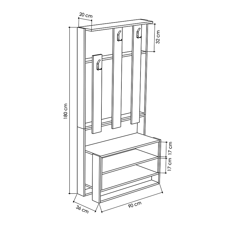 - Φέρει 2 ράφια στο κάτω μέρος και τρεις κρεμάστρες.