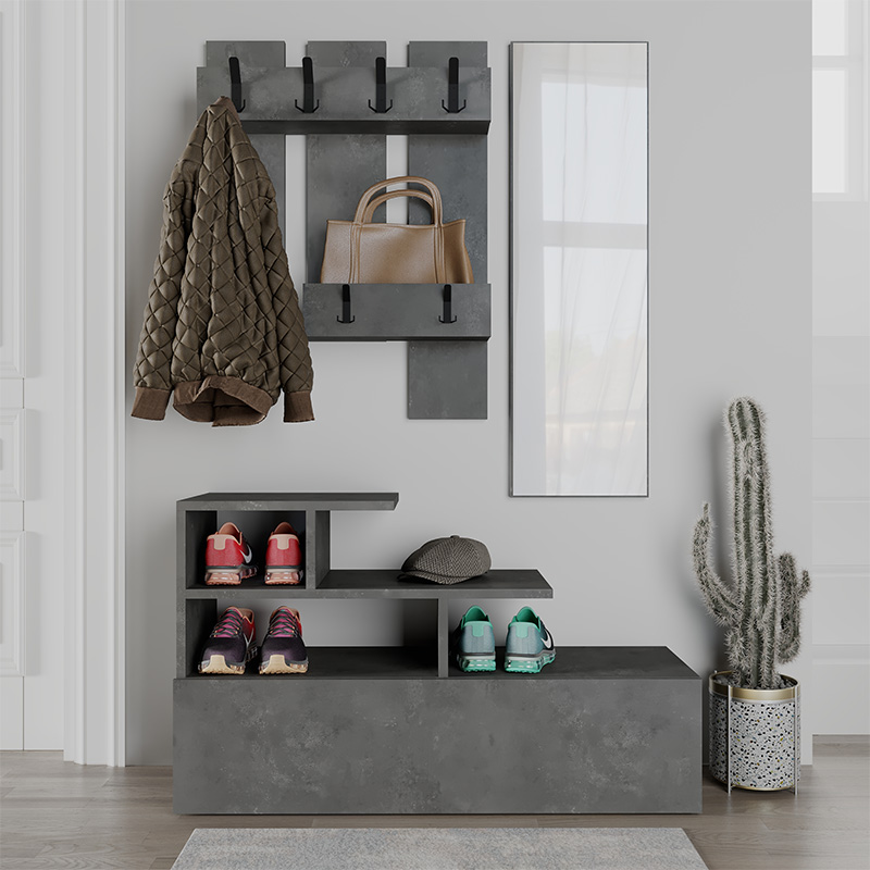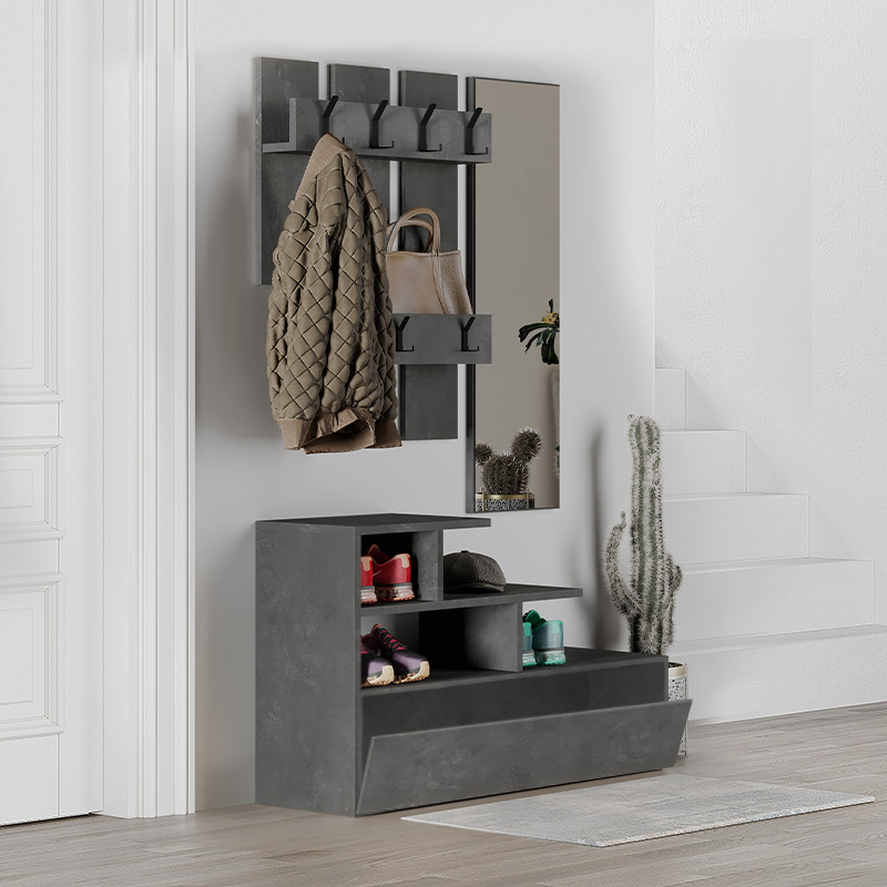 - Φέρει μία κρεμάστρα τοίχου, έναν καθρέφτη και τέσσερα ράφια.