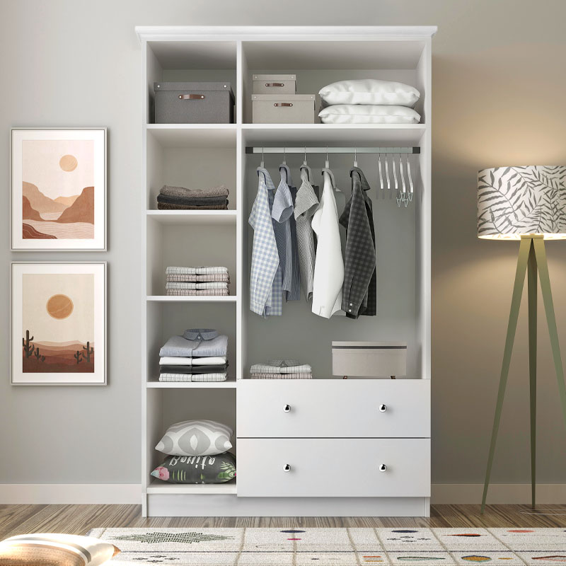 - Μια κεντρική διπλή ντουλάπα, στο εσωτερικό της φέρει μια βέργα αλουμινίου για κρεμάστρες. Στο κάτω μέρος φέρει δύο πρακτικά συρόμενα συρτάρια και στα αριστερά η ντουλάπα περιλαμβάνει ράφια.