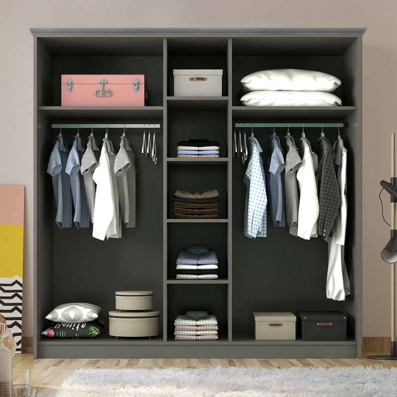 - Αριστερά και δεξιά η δίφυλλη ντουλάπα περιλαμβάνει μια ράγα αλουμινίου για κρεμάστρες και ένα ράφι.