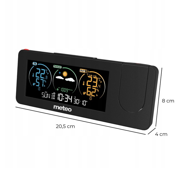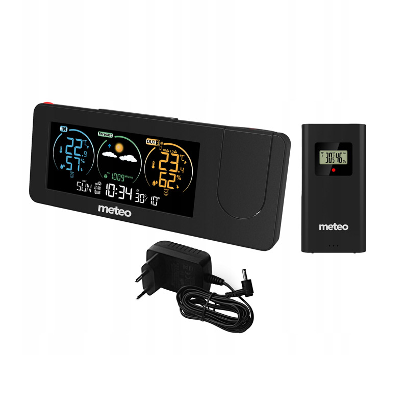 Ο μετεωρολογικός σταθμός, από την εταιρία Meteo, διαθέτει ασύρματη μέτρηση θερμοκρασίας εσωτερικού και εξωτερικού χώρου, καθώς και υγρασία αέρα εσωτερικού και εξωτερικού χώρου. Οι πρόσθετες λειτουργίες του μετεωρολογικού σταθμού είναι προβολέας ώρας και θερμοκρασίας, ένδειξη καιρού (εικονογράμματα που δείχνουν την τάση των αλλαγών του καιρού), βαρόμετρο, ρολόι με ξυπνητήρι, ξυπνητήρι με λειτουργία αναβολής και ένδειξη ημερομηνίας.