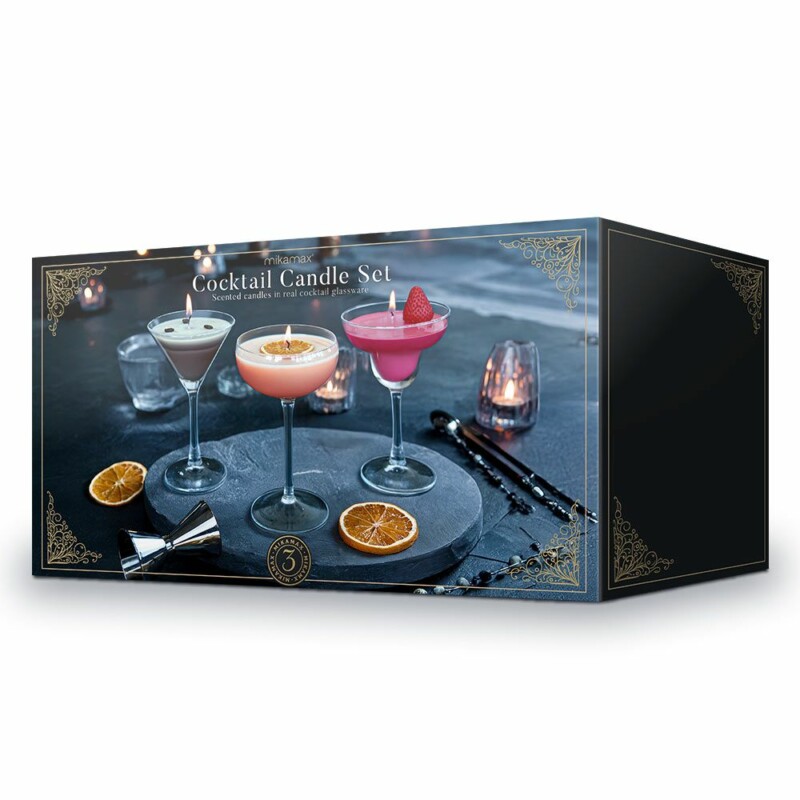 Το Cocktail Candle Set περιλαμβάνει τρία καλαίσθητα κεριά σε σχήμα κλασικών ποτηριών κοκτέιλ, το καθένα με άρωμα εμπνευσμένο από δημοφιλή κοκτέιλ: Pornstar Martini, Espresso Martini και Daiquiri.