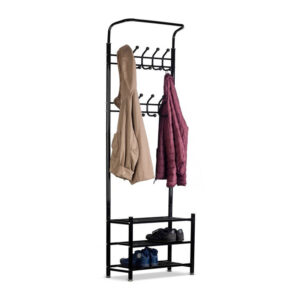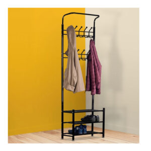 Το έπιπλο εισόδου, από την εταιρία ModernHome, είναι κατασκευασμένο από ανθεκτικό μέταλλο σε μαύρο χρώμα. Έχει ύψος 190 cm και έχει 2 σειρές με γάντζους με συνολικά 18 θέσεις για να κρεμάσετε ρούχα. Στην κορυφή της δομής, υπάρχει μια ράβδος στην οποία μπορείτε να κρεμάσετε ένα κασκόλ ή να αφήσετε μια ομπρέλα. Στο κάτω μέρος υπάρχουν 3 μεταλλικά ράφια για παπούτσια και άλλα αντικείμενα.