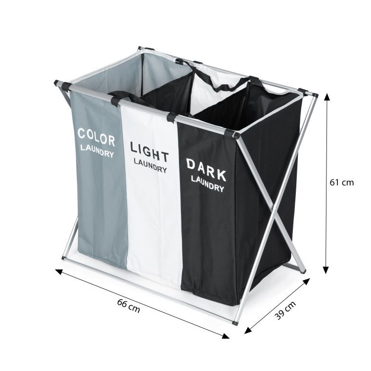 Το καλάθι διαλογής ρούχων είναι μια πρακτική λύση για κάθε σπίτι. Διαθέτει σταθερή και ελαφριά κατασκευή από αλουμίνιο και τρία υφασμάτινα καλάθια που διευκολύνουν τη διαλογή των ρούχων. Είναι πτυσσόμενο, γεγονός που διευκολύνει την αποθήκευση, ενώ οι βολικές λαβές επιτρέπουν εύκολη μεταφορά. Το καλάθι έχει χωρητικότητα 135 λίτρων, καθιστώντας το αρκετά μεγάλο για να χωράει μεγάλη ποσότητα ρούχων. Είναι ένα προϊόν που χαρακτηρίζεται από στιβαρή κατασκευή και λειτουργικότητα, ιδανικό για άτομα που εκτιμούν την τάξη.