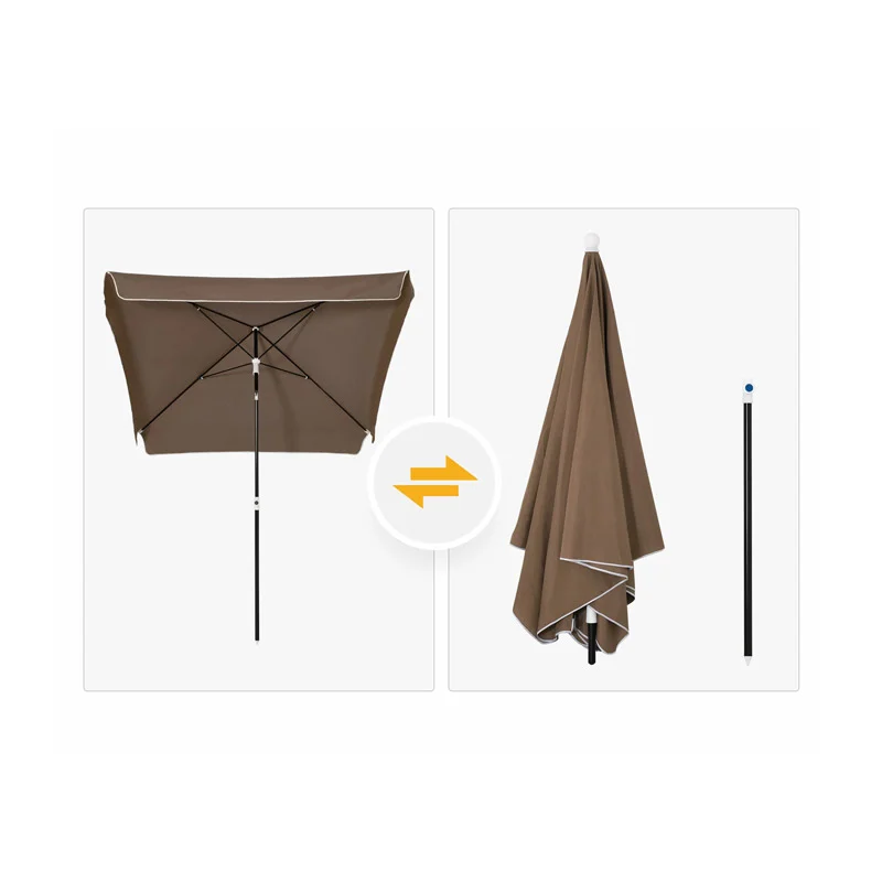 Η ομπρέλα, από την εταιρία Outsunny, διαθέτει μεταλλικό στύλο, ο οποίος μπορεί να αποσυναρμολογηθεί σε δύο μέρη για εύκολη μεταφορά. Το κάτω μέρος του πόλου έχει αιχμηρό σχήμα, έτσι ώστε να μπορεί να μπει απευθείας στο έδαφος ή στην άμμο. Μπορείτε να προσαρμόσετε τη γωνία του ανθεκτικού στην υπεριώδη ακτινοβολία θόλου από πολυεστέρα, για να παραμείνετε στη σκιά όλη την ημέρα.