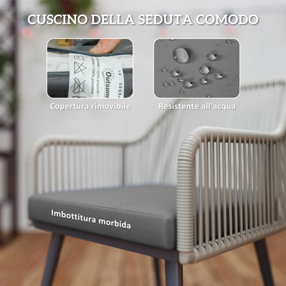 Οργανώστε πολλές συναντήσεις με φίλους και συγγενείς με το σετ κήπου Outsunny που αποτελείται από 4 καρέκλες και ένα στρογγυλό τραπέζι. Το σετ είναι κατασκευασμένο από ατσάλι και ρατάν, με ειδικά διαμορφωμένη πλάτη και μπράτσα που προσφέρουν την κατάλληλη υποστήριξη και είναι εμπλουτισμένα με μαλακά μαξιλάρια για μέγιστη άνεση. Το τραπέζι κήπου διαθέτει επιφάνεια από σκληρυμένο γυαλί και κεντρική οπή Ø4.2 cm για την τοποθέτηση ομπρέλας και τη δημιουργία σκιάς σε εξωτερικούς χώρους.