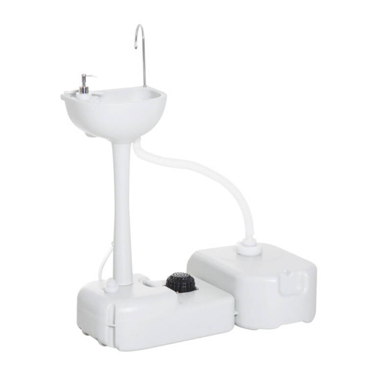 Ο φορητός νιπτήρας από την εταιρεία Outsunny αποτελεί ένα απαραίτητο αξεσουάρ για υπαίθριες εκδηλώσεις ή κάμπινγκ. Πρακτικός και ελαφρύς, είναι κατασκευασμένος από υψηλής ποιότητας πλαστικό υλικό (HDPE), ανθεκτικό και φιλικό προς το περιβάλλον. Διαθέτει μια δεξαμενή νερού (η οποία μπορεί να χωρέσει έως και 17 Lt) και μια δεξαμενή αποβλήτων (χωρητικότητας 24 Lt) που μπορείτε εύκολα να αδειάσετε. Επιπλέον, υπάρχει ενσωματωμένη μια δεξαμενή 3.5 Lt στην οποία μπορείτε να βάλετε σαπούνι ή απολυμαντικό χεριών. Είναι εξοπλισμένος επίσης με τροχούς και λαβή, ώστε να μπορείτε να τον μετακινήσετε εύκολα.