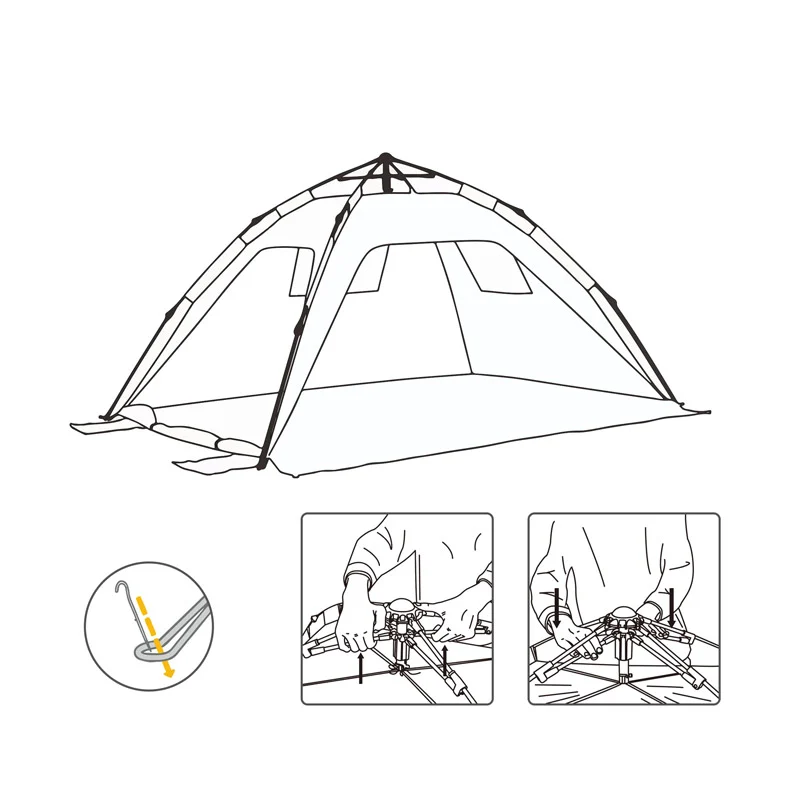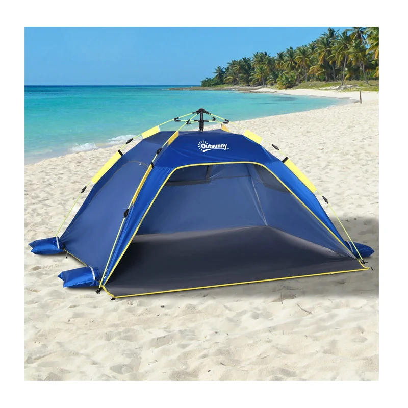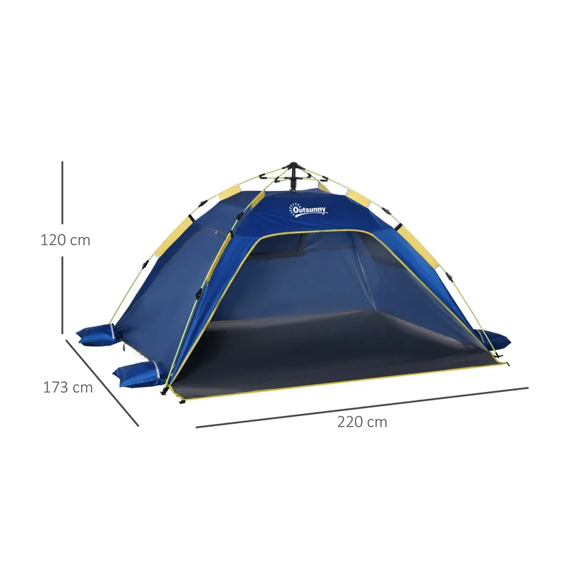 Η σκηνή, από την εταιρία Outsunny, διαθέτει ένα αναδυόμενο σύστημα ανοίγματος (pop-up), το οποίο σας επιτρέπει να την έχετε έτοιμη σε δευτερόλεπτα. Είναι εξοπλισμένη με πασαλάκια για να στερεωθεί στο έδαφος και 4 πλαϊνούς σάκους για να γεμίσει με άμμο, αυξάνοντας τη σταθερότητα της.