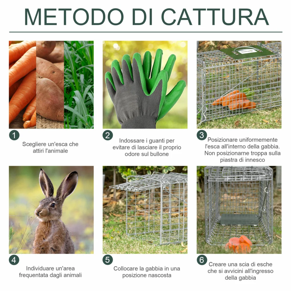Η παγίδα ζώων, από την εταιρία Outsunny, σας επιτρέπει να παίρνετε με ασφάλεια άγρια ζώα χωρίς να τα βλάπτετε, ώστε να μπορείτε να τα απελευθερώσετε σε περιοχές που είναι πιο κατάλληλες για αυτά. Η παγίδα ενεργοποιείται μόλις το ζώο πατήσει το εσωτερικό πεντάλ και το σύστημα ελατηρίου κλείνει την πόρτα. Από μασίφ ατσάλι με επίστρωση πούδρας, αντιστέκεται στη σκουριά και είναι κατάλληλη για εξωτερική χρήση.