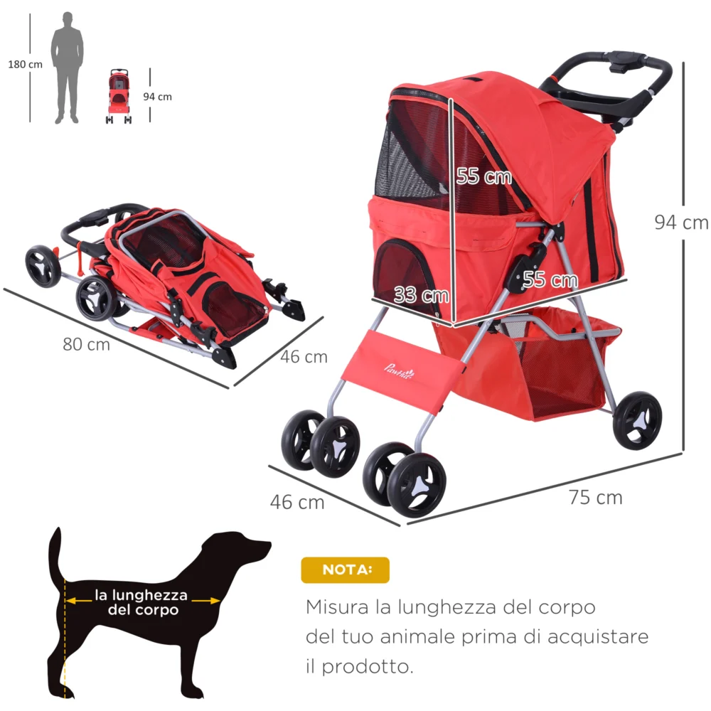 Πτυσσόμενο καρότσι κατοικίδιων PawHut, κόκκινο, 75 x 46 x 94 cm D00-083RD