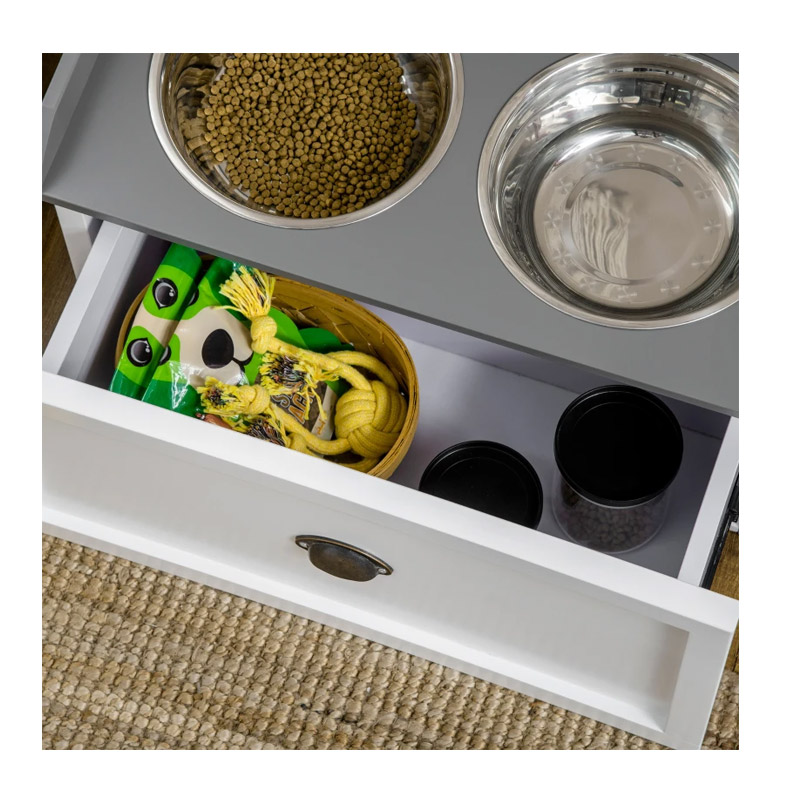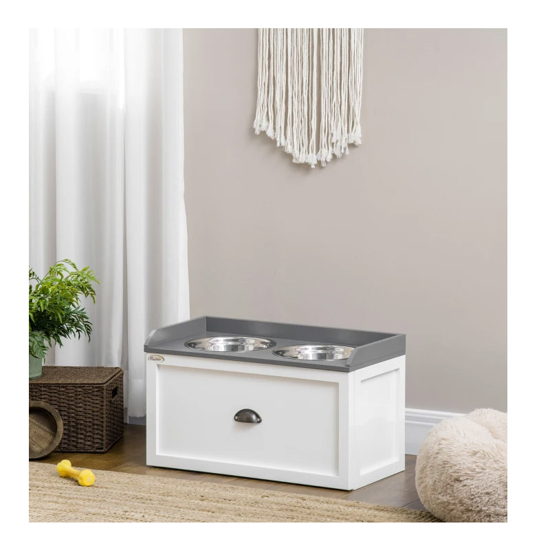 Το σετ, από την εταιρία PawHut, αποτελείται από 2 αφαιρούμενα μπολ από ανοξείδωτο ατσάλι, κατάλληλα για στεγνή, υγρή τροφή και νερό για τη σωστή σίτιση του κατοικίδιου σας και 1 ξύλινο συρτάρι, ιδανικό για την αποθήκευση της τροφής του. Ο ανυψωμένος σχεδιασμός του, τα βοηθά να φτάνουν το φαγητό τους εύκολα χωρίς να σκύβουν.