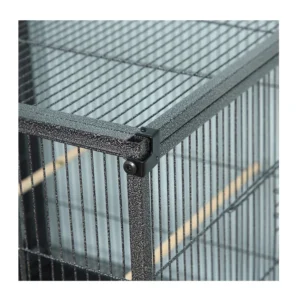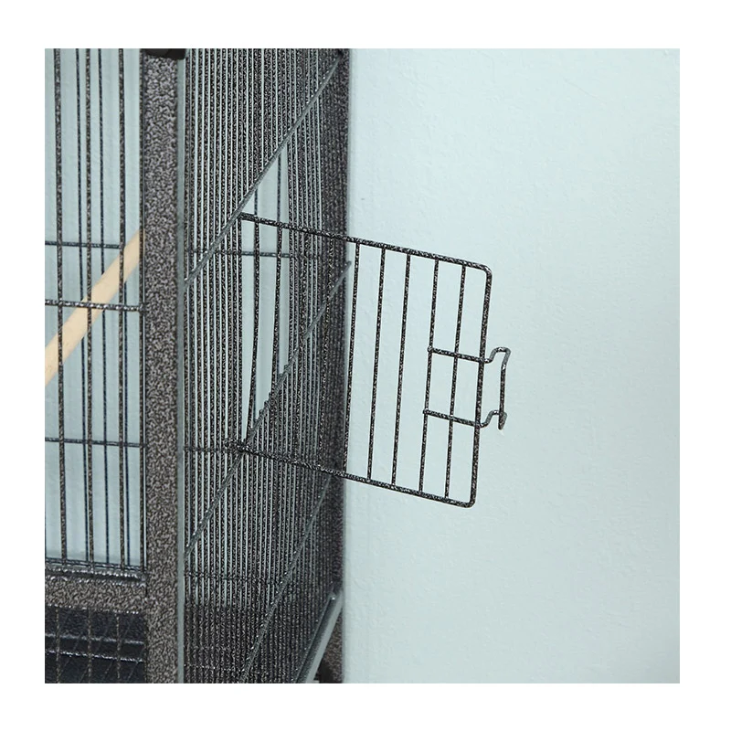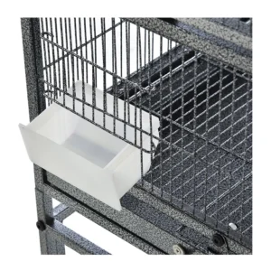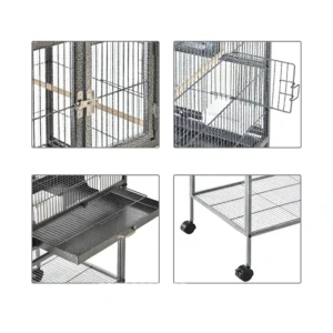 Το κλουβί, είναι εξοπλισμένο με 2 αφαιρούμενους δίσκους στο κάτω μέρος με εύκολο καθαρισμό και 4 τροχοί εκ των οποίων οι 2 με φρένο. Στο κάτω μέρος υπάρχει ράφι για να τοποθετήσετε τα απαραίτητα αξεσουάρ για τα πουλιά.