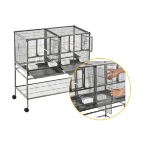 Το διπλό κλουβί μεταφοράς πτηνών, από την εταιρία PawHut, διαθέτει στερεή δομή από μέταλλο, σύρμα σιδήρου και ανθεκτικό πλαστικό για παρατεταμένη χρήση στο χρόνο. Η κεντρική γρίλια μπορεί να αφαιρεθεί για να δημιουργηθεί ένα ενιαίο μεγάλο κλουβί. Διαθέτει 2 μεγάλες μπροστινές πόρτες και 2 πλαϊνές για πρακτική πρόσβαση, 4 μικρές συρόμενες πόρτες για την εισαγωγή τροφίμων και νερού, 4 ξύλινες πέρκες για να κάθονται τα πουλιά και 4 πλαστικά μπολ.