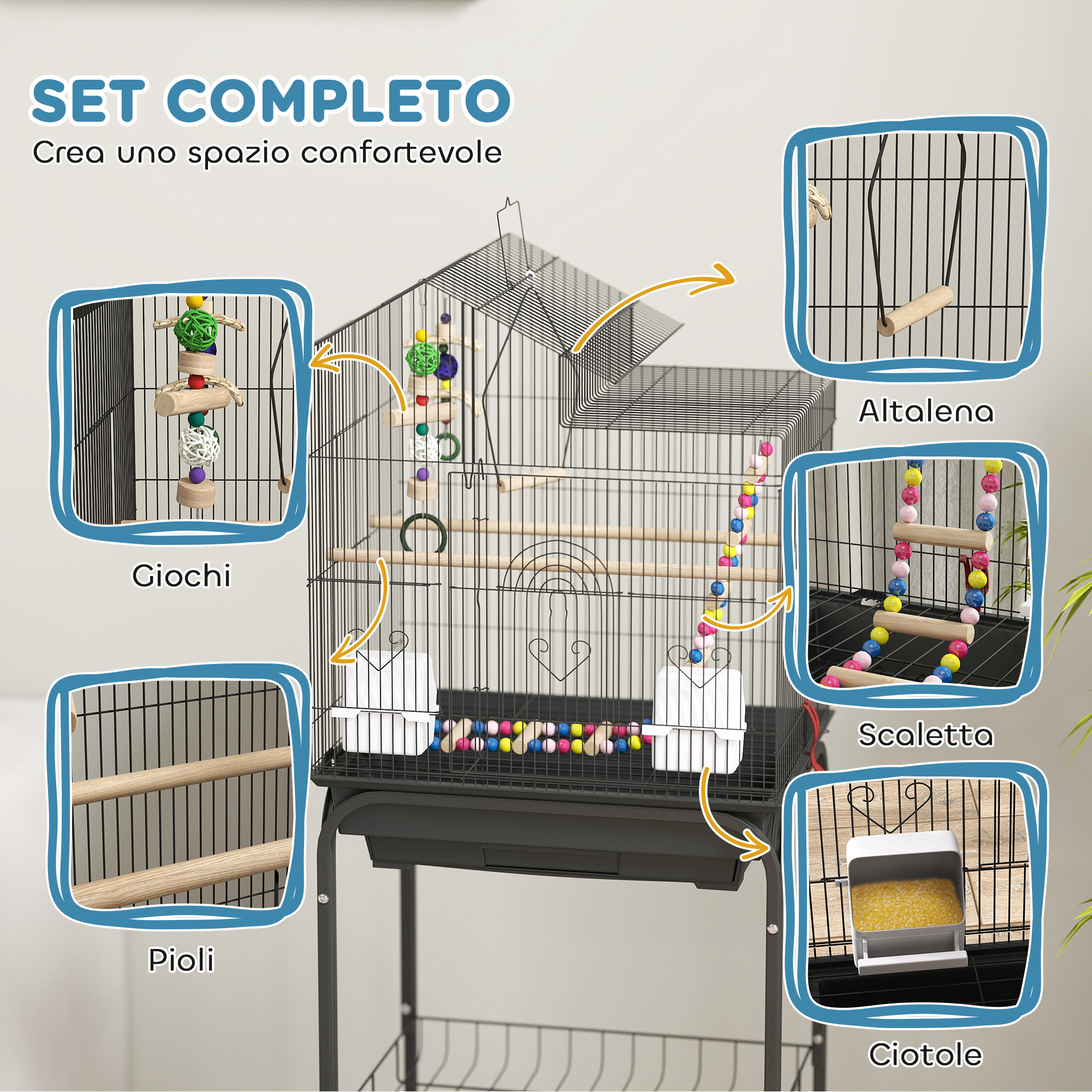 PawHut Κλουβί για Πουλιά με Βάση, Περιστρεφόμενες Ρόδες, Ράφι και Αξεσουάρ, 46x36x120 εκ., Μαύρο D10-081V01BK