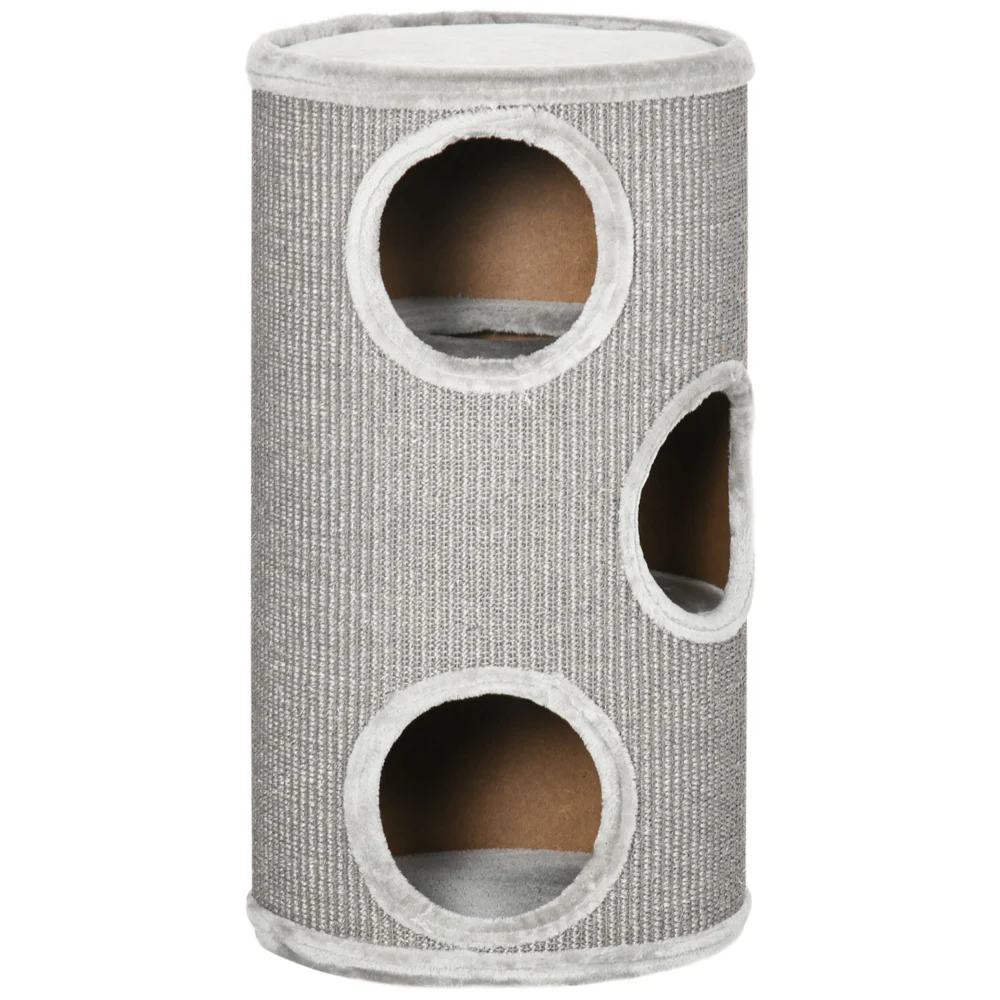 PawHut Σπίτι 3 επιπέδων για γάτες με σιζάλ και βελούδινα γρατσουνίσματα, Ø38×70 cm, ανοιχτό γκρι D30-535V00LG