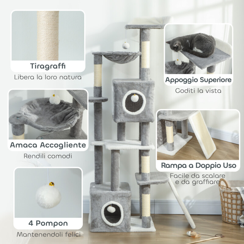 PawHut Δέντρο Αναρρίχησης για Γάτες με 2 Σπιτάκια, Ράμπα, Πλατφόρμες και 4 Μπαλίτσες, 48x40x165 cm, Γκρι και Λευκό D30-906V00GY