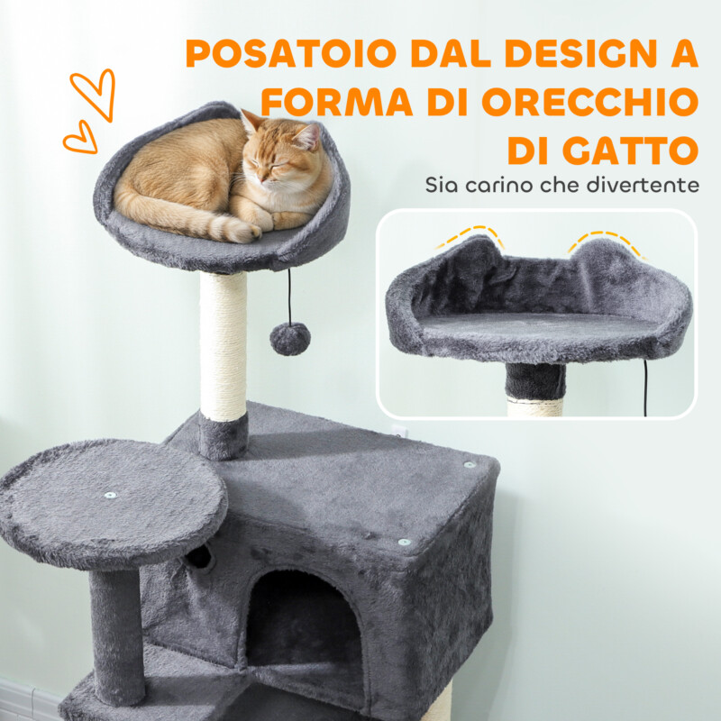 PawHut Υψηλό Δέντρο Γάτας 140 εκ. με 2 Σπιτάκια, Κρεβάτι και Αιώρα για 2-3 Γάτες, Επένδυση από Λούτρινο Υλικό, Γκρι D30-920V00CG