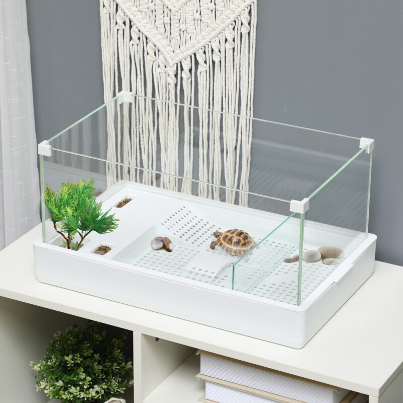 Αυτή η δεξαμενή προσφέρει το ιδανικό περιβάλλον για τις χελώνες σας, με ζώνες για φαγητό, ηλιοθεραπεία, κολύμπι και ωοτοκία. Οι γυάλινες πλευρές αποτρέπουν τις αποδράσεις και καθαρίζονται εύκολα χάρη στον τριών επιπέδων σχεδιασμό που διευκολύνει την απομάκρυνση βρωμιάς και υπολειμμάτων.