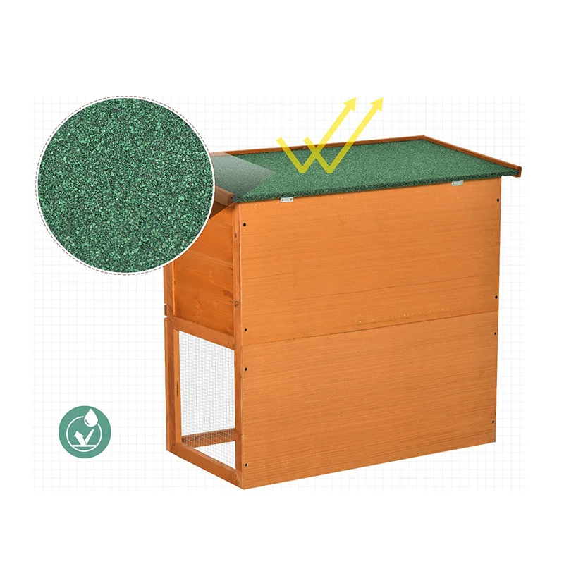 Στη βάση του υπάρχει ένας ευρύχωρος χώρος που συνδέεται με τη φωλιά με ράμπα. Εξοπλισμένο με πόρτα από ξύλο και παράθυρο από σιδερένιο σύρμα, ώστε να έχετε εύκολη πρόσβαση στα ζωάκια σας. Με ανοιγόμενη οροφή και με επένδυση από τσόχα που εγγυάται υδατοαπωθητική και μονωτική λειτουργία, καθώς και με αφαιρούμενο δίσκο για εύκολο καθαρισμό.