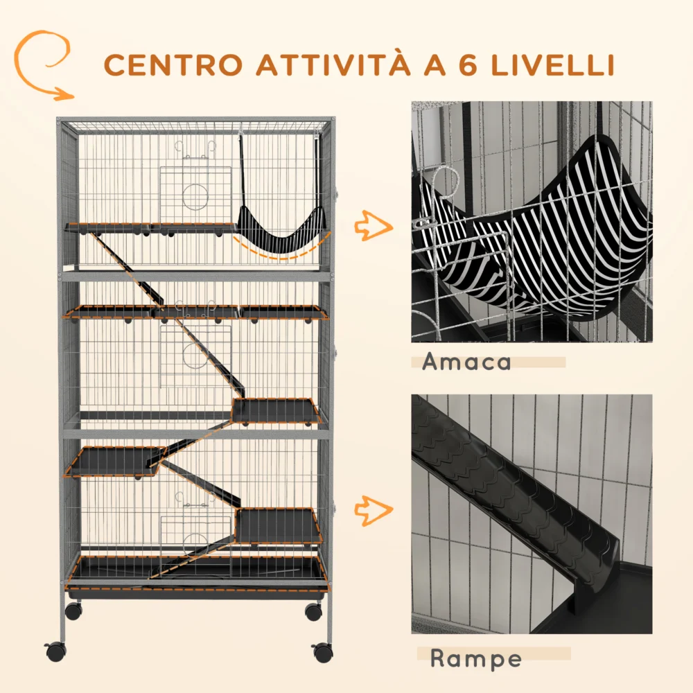 PawHut Rabbit Cage με 4 εισόδους σε πολλαπλά επίπεδα με αιώρα, ατσάλι και PP, 80x52x159 cm D51-113V01GY