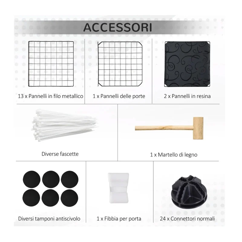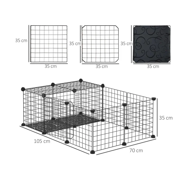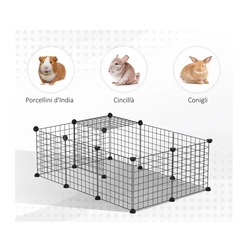 Το κλουβί – πάρκο εκπαίδευσης για κατοικίδια, από την εταιρεία PawHut, έχει σχεδιαστεί για μικρά κατοικίδια ζώα, όπως κουνέλια, ινδικά χοιρίδια, τσιντσιλά, χάμστερ και παρόμοια ζώα. Μπορεί να διαμορφωθεί σύμφωνα σε διάφορα σχήματα και μεγέθη. Αποτελείται από 13 συρμάτινα πάνελ, 1 πάνελ με πόρτα και 2 βάσεις ρητίνης.