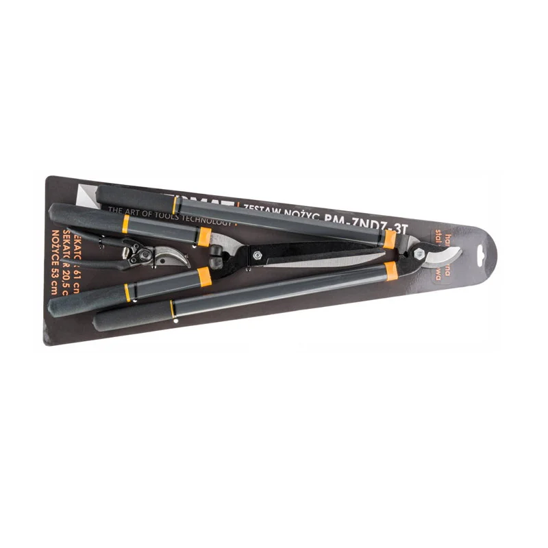 Το σετ, από την εταιρία POWERMAT, αποτελείται από 3 ψαλίδια, κατάλληλα για λουλούδια, θάμνους, αμπέλια, κλαδιά και άλλα φυτά κήπου. Κατασκευασμένα από ατσάλι με άνετες λαβές από καουτσούκ και αφρό.