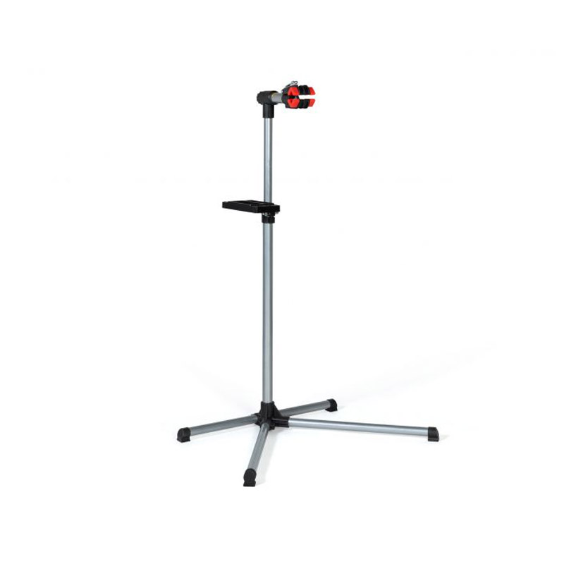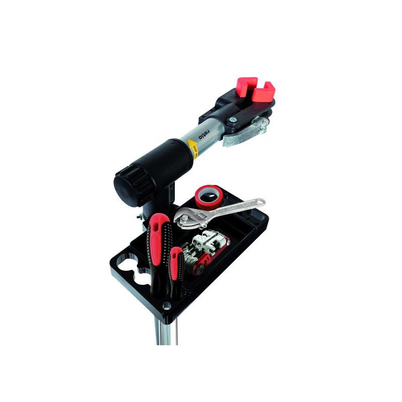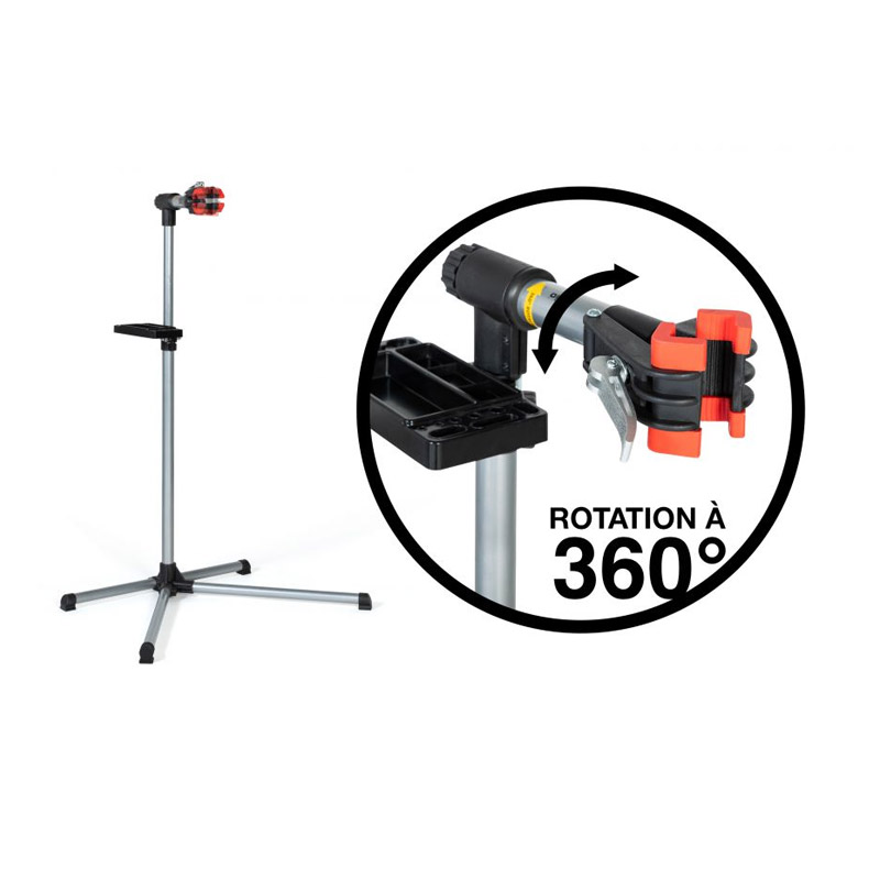 Ο βραχίονας στήριξης, που υποστηρίζει το ποδήλατο, είναι περιστρεφόμενος κατά 360° και είναι εξοπλισμένος με ένα πρακτικό ρυθμιζόμενο σφιγκτήρα από 25 έως 70 mm, που σας επιτρέπει να τοποθετήσετε τα περισσότερα από τα τυπικά ποδήλατα της αγοράς. Περιλαμβάνει επίσης έναν ορθογώνιο δίσκο για εργαλεία και αξεσουάρ.