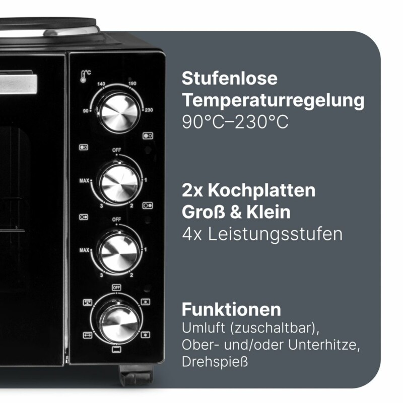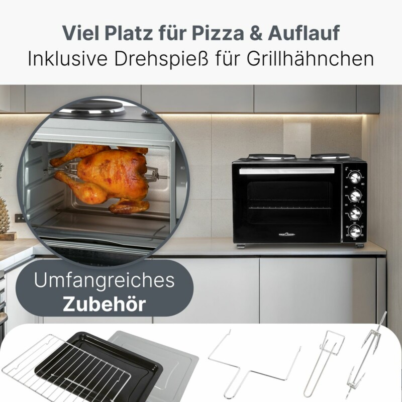 Πολυλειτουργική Κουζίνα με Φούρνο, Περιστρεφόμενη Σούβλα και 2 Εστίες – Μαύρο PC-KK1302-Black Proficare