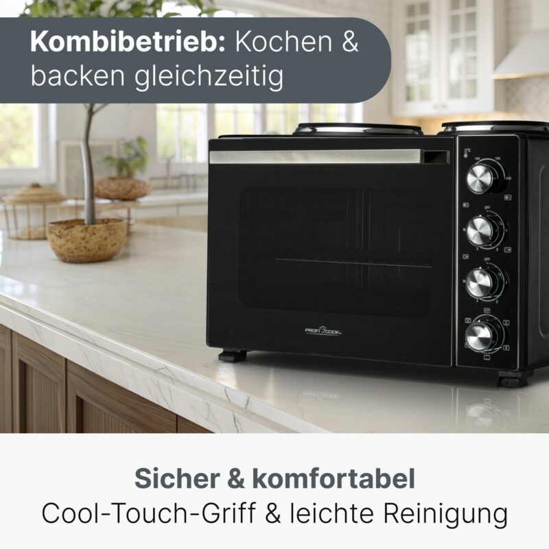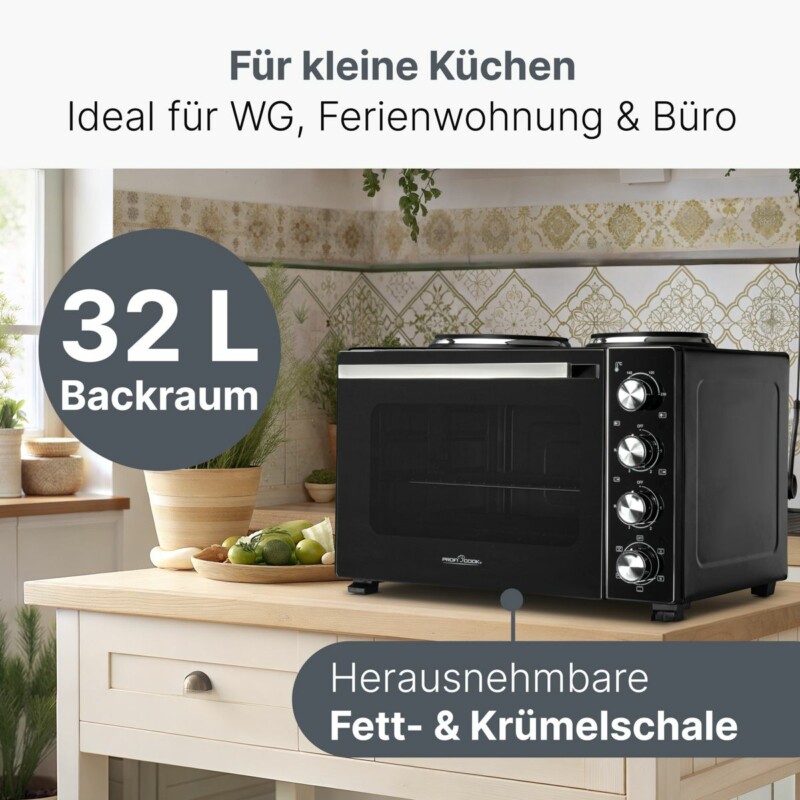Η μικρή κουζίνα ProfiCook PC-KK 1302 αποτελεί την απόλυτη λύση για μικρούς χώρους, φοιτητικά διαμερίσματα, εξοχικά ή βοηθητική χρήση σε μεγάλες κουζίνες. Συνδυάζει φούρνο με αέρα και σούβλα, δύο εστίες και πλήθος δυνατοτήτων ψησίματος, προσφέροντας μεγάλη ευελιξία και άνεση στη μαγειρική.