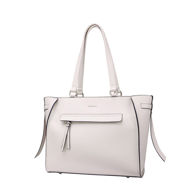 Η γυναικεία τσάντα χειρός, από την εταιρία Puccini, είναι κατασκευασμένη από υψηλής ποιότητας οικολογικό δέρμα με ελαφρώς ανάγλυφη υφή. Στο εσωτερικό της έχει τρεις τσέπες, δύο ανοιχτές και μία με φερμουάρ. Το μπροστινό μέρος της είναι διακοσμημένο με ένα διακριτικό λογότυπο της εταιρίας και μία τσέπη με φερμουάρ. Διαθέτει λαβές βέλτιστου μήκους (φοριέται και στον ώμο) και προστατευτικά διακριτικά πόδια στο κάτω μέρος.