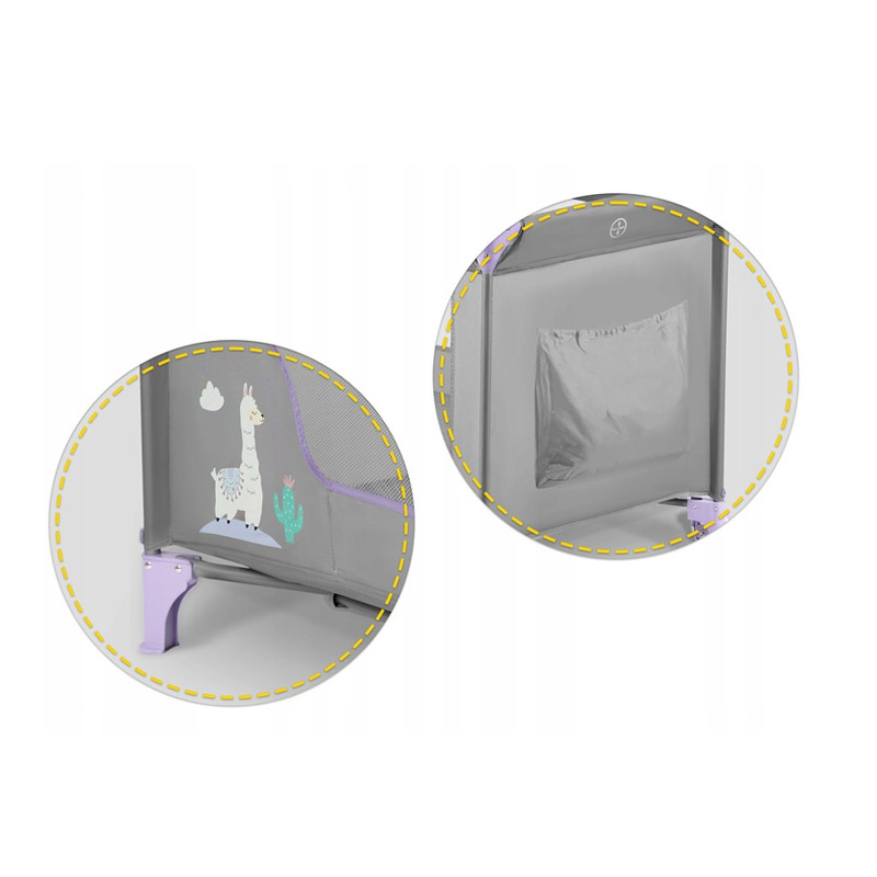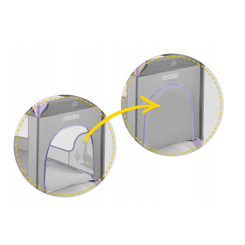 Το παρκοκρέβατο, είναι εξοπλισμένο με αποσπώμενη πλαϊνή είσοδο, η οποία είναι αδιαπέραστη από τα μικρά παιδιά χάρη στο φερμουάρ που είναι ραμμένο από έξω. Από την άλλη πλευρά, τα παιδιά μεγαλύτερης ηλικίας, πιο ευέλικτα, μπορούν να μπουν και να σηκωθούν από το κρεβάτι ανεξάρτητα, άνετα και με ασφάλεια – χάρη σε αυτό, δεν θα προσπαθήσουν να σκαρφαλώσουν στην επάνω άκρη. Μια πρακτική τσέπη θα είναι χρήσιμη για τα μικροπράγματα του μωρού σας.