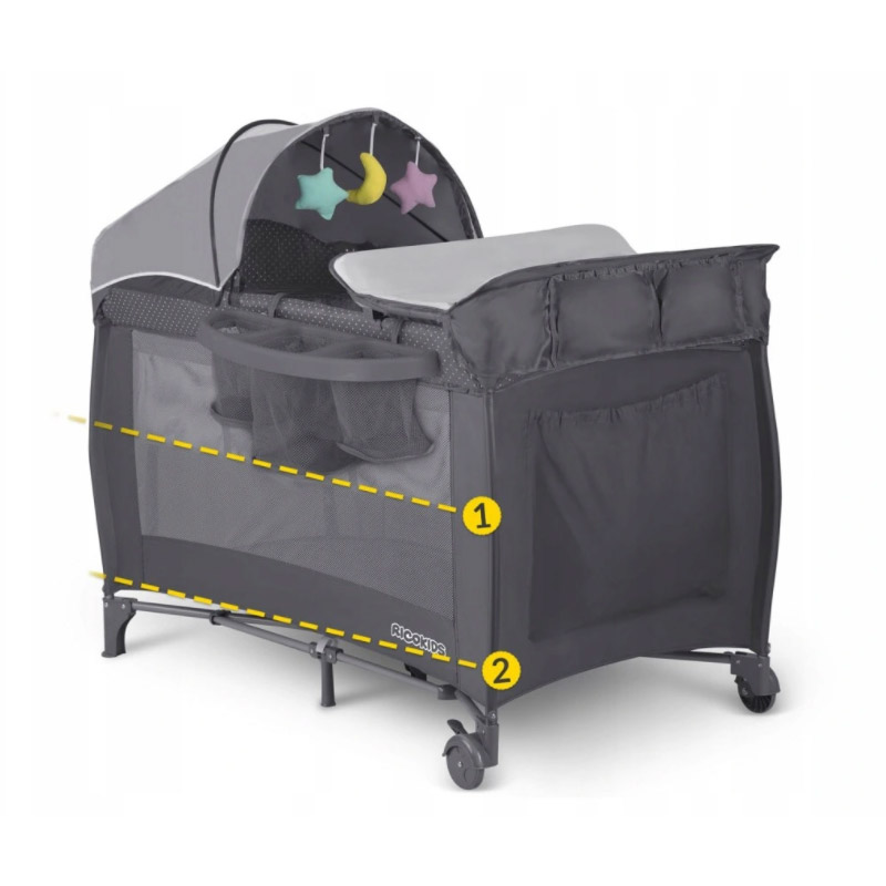 Η θέση για το στρώμα μπορεί να ανυψωθεί και να χαμηλώσει. Χάρη σε αυτό, μπορείτε να προσαρμόσετε το βάθος του κρεβατιού στο στάδιο ανάπτυξης του παιδιού, διευκολύνοντας τη φροντίδα του και δυσκολεύοντας το να πέσει από το κρεβάτι. Περιλαμβάνει θόλο με κρεμαστά παιχνίδια και αλλαξιέρα στο πάνω μέρος, η οποία μπορεί να απαγκιστρωθεί ή να χαμηλώσει στο πλάι ανά πάσα στιγμή, χρησιμοποιώντας τη μόνο όταν χρειάζεται.