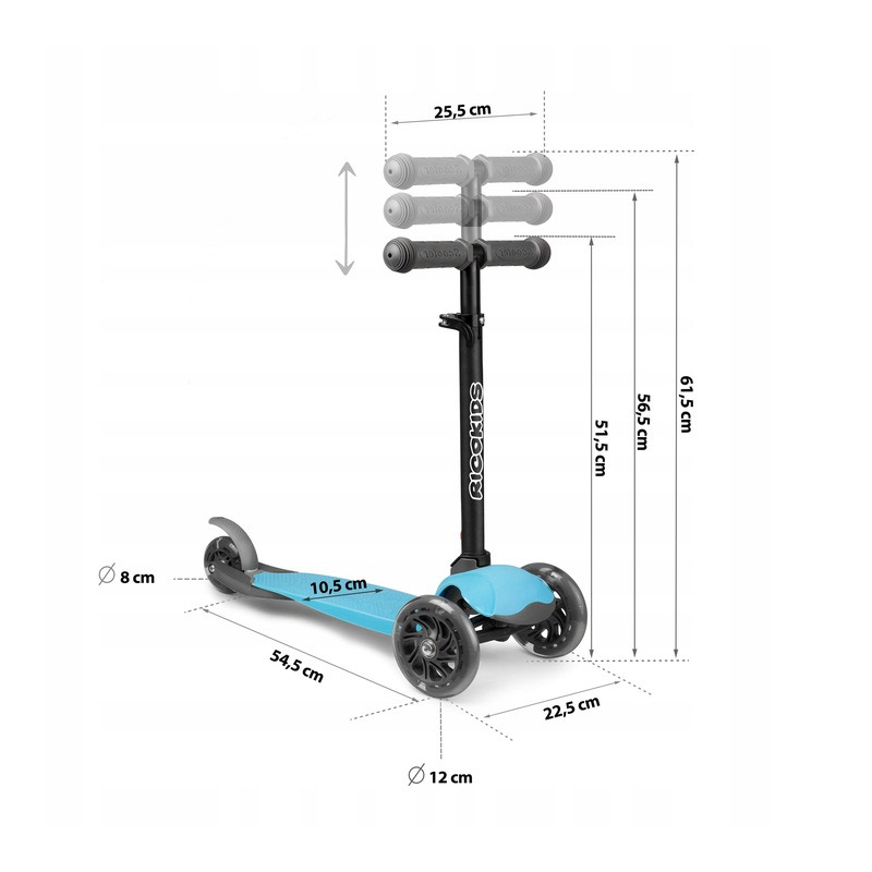 Το πατίνι, έχει ενσωματωμένο δυναμό χάρη στον οποίο οι τροχοί ανάβουν κατά την οδήγηση. Διαθέτει τιμόνι με πλαίσιο αλουμινίου, μεγάλες και αντιολισθητικές λαβές και ρυθμιζόμενο ύψος σε 3 επίπεδα. Εξοπλισμένο με φαρδιά και αντιολισθητική πλάκα ποδιού και πιστοποιητικό που επιβεβαιώνει τη συμμόρφωση με το ευρωπαϊκό πρότυπο EN 71.