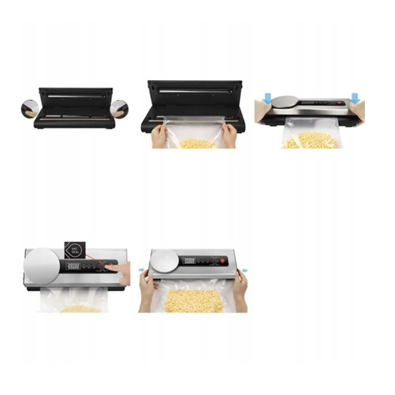 Επίσης, η συσκευή έχει ενσωματωμένη ζυγαριά τροφίμων η οποία όταν δεν χρησιμοποιείται, μπορεί να αποθηκευτεί στο κάτω μέρος της συσκευής. Η λειτουργία της συσκευής είναι απλή και εύκολη. Ο αεροστεγής τρόπος κλεισίματος εξασφαλίζει την προστασία των τροφών από την ανάπτυξη μικροβίων, αποφεύγεται η οξείδωση, η φθορά και οι οσμές.