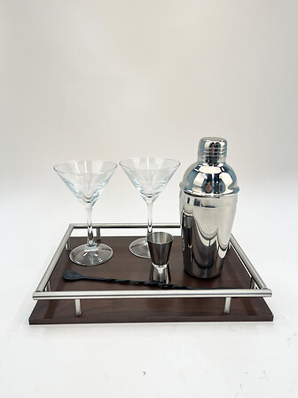 Ανακαλύψτε το σετ κοκτέιλ Jules που προσφέρει δυο ποτήρια κοκτέιλ, ένα shaker, έναν δοσομετρητή και ένα κουτάλι ανάδευσης. Όλα τοποθετημένα σε κομψό ξύλινο δίσκο με μεταλλική λαβή. Ιδανικό για το οικιακό σας μπαρ ή ως ένα εκλεπτυσμένο δώρο!