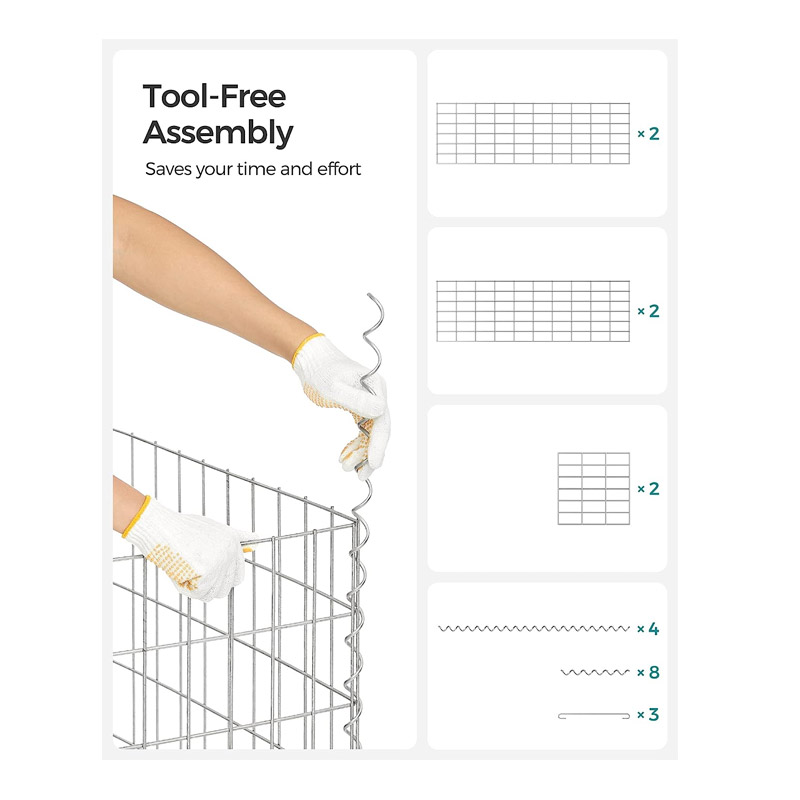 Δεν χρειάζονται εργαλεία για τη συναρμολόγησή του, απλώς ευθυγραμμίστε τα παρακείμενα πλέγματα και στρίψτε τις σπειροειδείς ράβδους για να τις συνδέσετε μεταξύ τους. 3 συμπεριλαμβανόμενα άγκιστρα διαχωρισμού συνδέουν τα απέναντι συρμάτινα πάνελ στενά μεταξύ τους, έτσι ώστε το συρματοκιβώτιο να μπορεί να κρατήσει το σχήμα του ακόμα και όταν είναι γεμάτο με πέτρες ή άλλα υλικά.