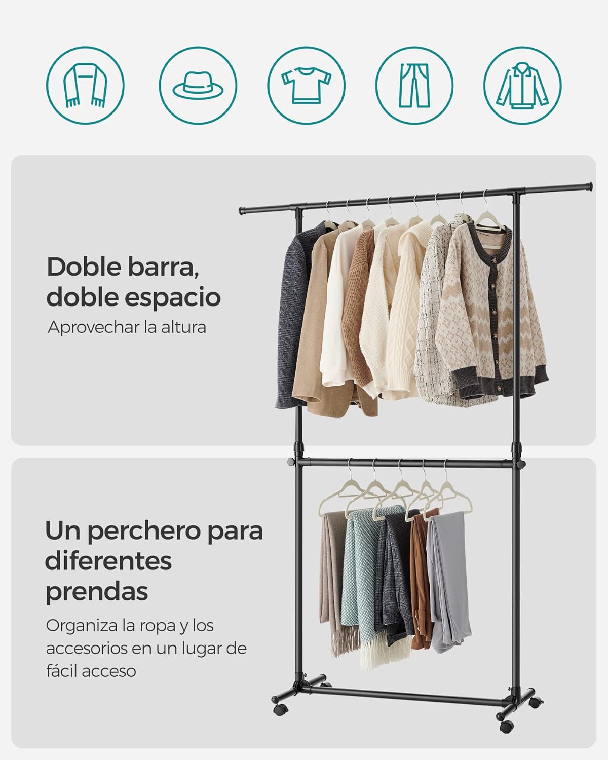 Με 2 ράβδους κρεμάσματος, αυτό το σταντ μεγιστοποιεί τη χωρητικότητα αποθήκευσης και σας βοηθά να αξιοποιήσετε πλήρως κάθε εκατοστό του χώρου σας.