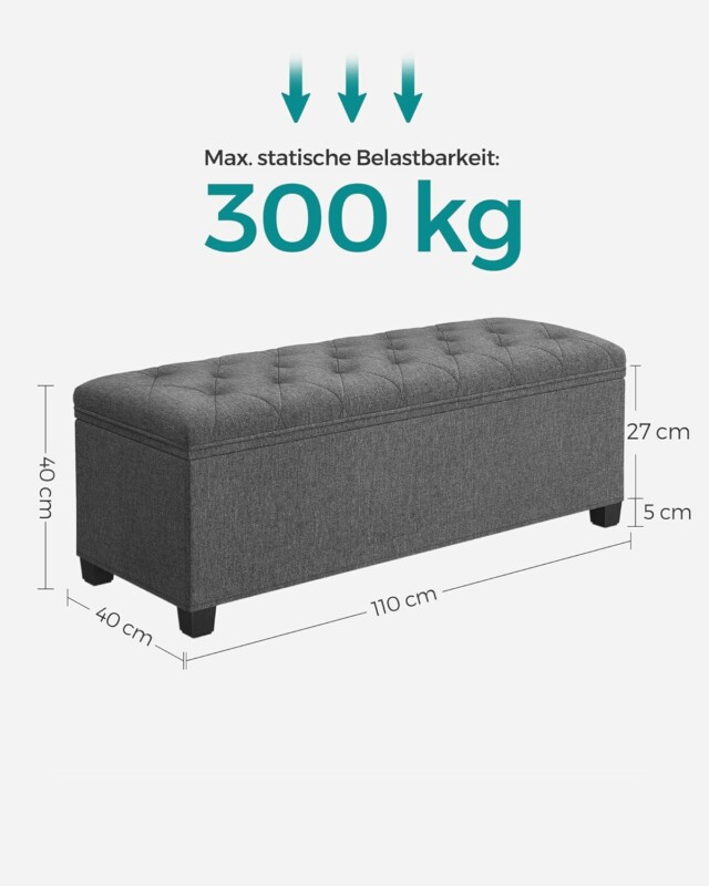 Το σκαμπό SONGMICS με αποθηκευτικό χώρο συνδυάζει λειτουργικότητα και κομψότητα, αποτελώντας ιδανική λύση για το σαλόνι, την κρεβατοκάμαρα ή το χολ. Με ύφασμα λινό σε όψη, καπιτονέ σχέδιο και μεταλλικά ενισχυμένα πόδια, προσφέρει στιλ και άνεση, ενώ ταυτόχρονα εξοικονομεί χώρο.