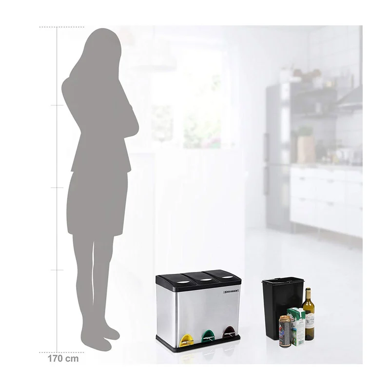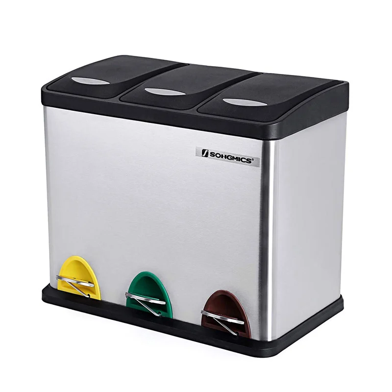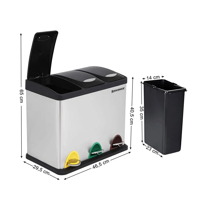 Ο κάδος απορριμμάτων, από την εταιρία Songmics, είναι κατασκευασμένος από ανοξείδωτο ατσάλι με πλαστική βάση και λεία επιφάνεια, χαρακτηριστικό που ευνοεί τον εύκολο καθαρισμό. Είναι εξοπλισμένος με 3 αφαιρούμενα πλαστικά διαμερίσματα συνολικής χωρητικότητας 24 Lt (3 x 8 Lt). Είναι εφοδιασμένα με μεταλλικές λαβές μεταφοράς, για να μπορείτε να τα αδειάζετε ξεχωριστά. Επιπρόσθετα, κάθε διαμέρισμα διαθέτει μηχανισμό με αντιολισθητικό πεντάλ, ώστε η απόρριψη των απορριμμάτων να πραγματοποιείται με απολύτως άνετο και υγιεινό τρόπο.