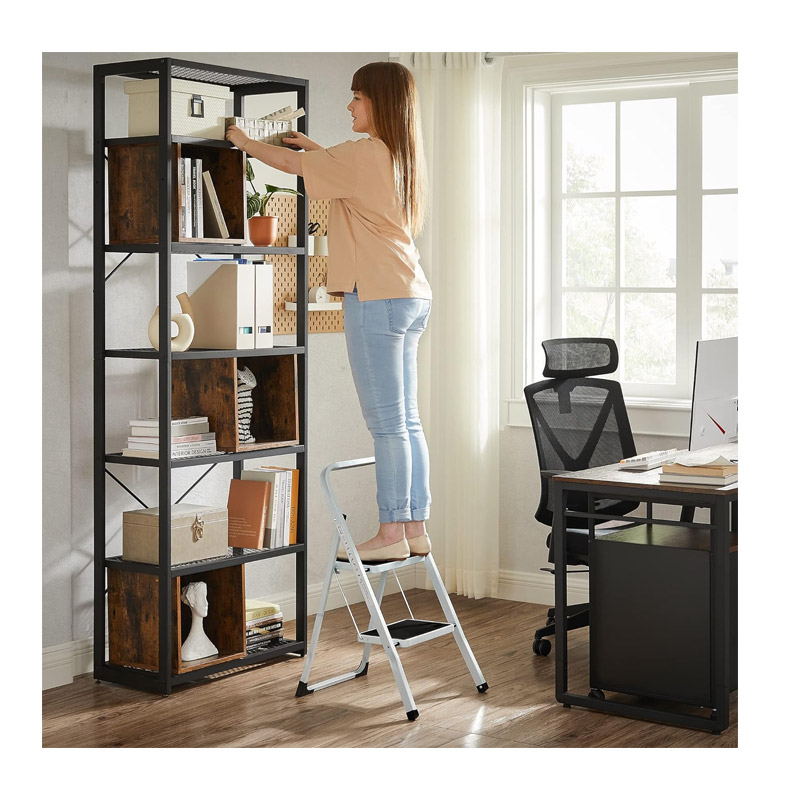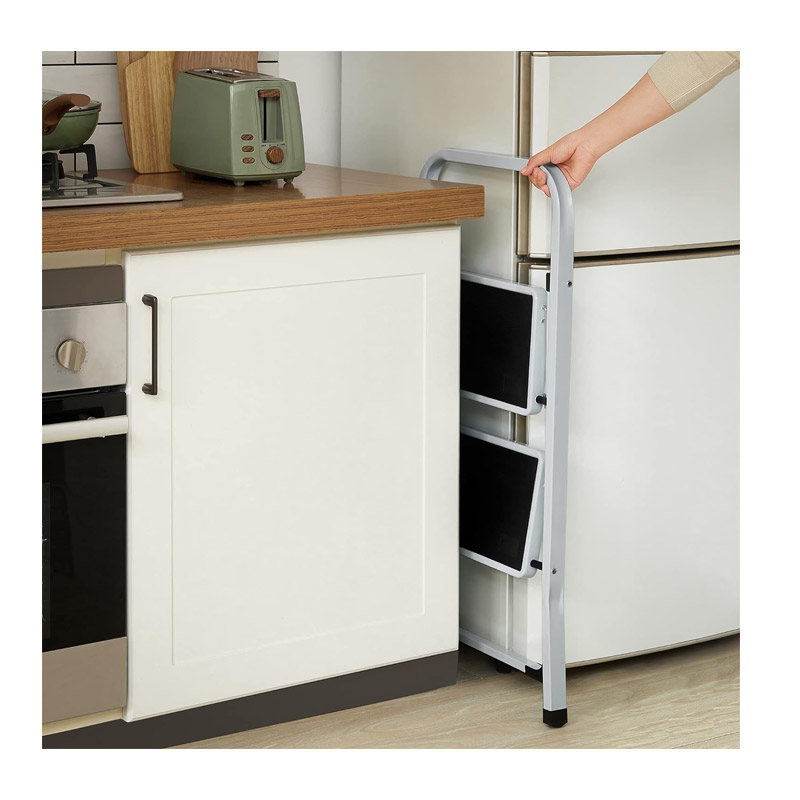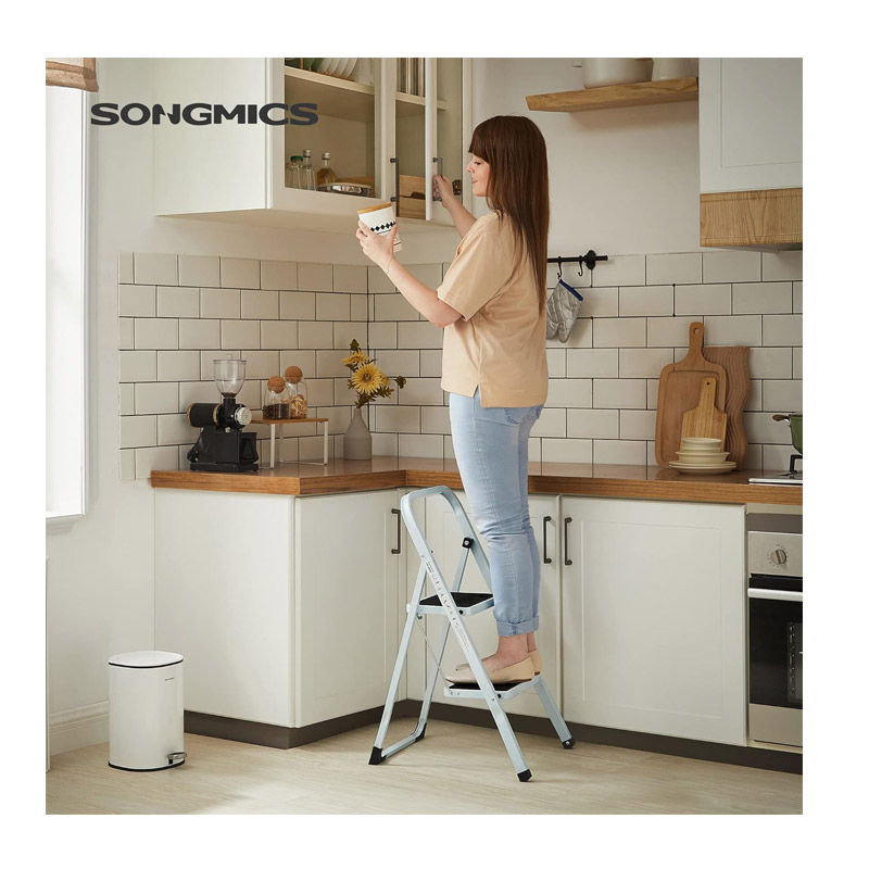 Η σκάλα, από την εταιρία Songmics, έχει πτυσσόμενο σχεδιασμό και είναι κατασκευασμένη από ατσάλι, με μέγιστο βάρος τα 150 Kg. Τα 4 πόδια έχουν φορά προς τα έξω για να υποστηρίζουν σταθερά τη σκάλα κατά τη χρήση. Το μάνδαλο ασφαλείας κλειδώνει αυτόματα όταν ανοίξει η σκάλα και εμποδίζει την κατά λάθος αναδίπλωση της. Τα 2 σκαλοπάτια με αυλακώσεις και τα πόδια με προστατευτικά άκρα, αποτρέπουν την ολίσθηση και προστατεύουν επίσης τα δάπεδα από γρατζουνιές.