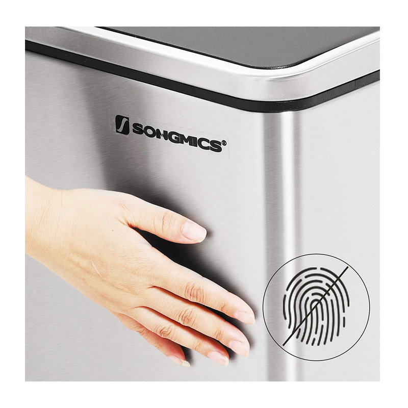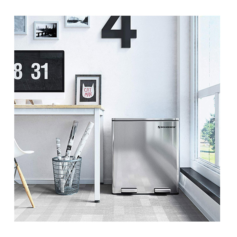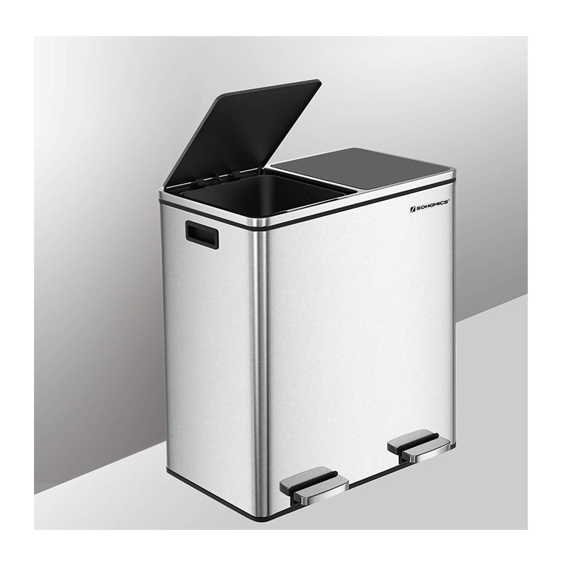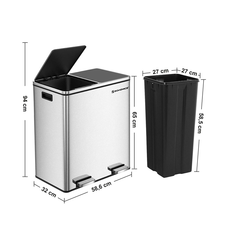 Ο κάδος απορριμμάτων, από την εταιρία Songmics, είναι κατασκευασμένος από ανοξείδωτο ατσάλι με πλαστική βάση. Είναι εξοπλισμένος με 2 αφαιρούμενα πλαστικά διαμερίσματα συνολικής χωρητικότητας 60 Lt (2 x 30 Lt). Είναι εφοδιασμένα με μεταλλικές λαβές μεταφοράς, για να μπορείτε να τα αδειάζετε ξεχωριστά. Επιπρόσθετα, κάθε διαμέρισμα διαθέτει μηχανισμό με αντιολισθητικό πεντάλ, ώστε η απόρριψη των απορριμμάτων να πραγματοποιείται με απολύτως άνετο και υγιεινό τρόπο.