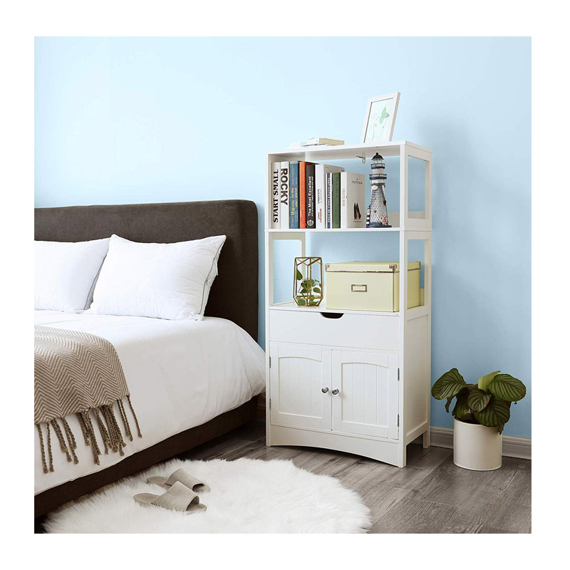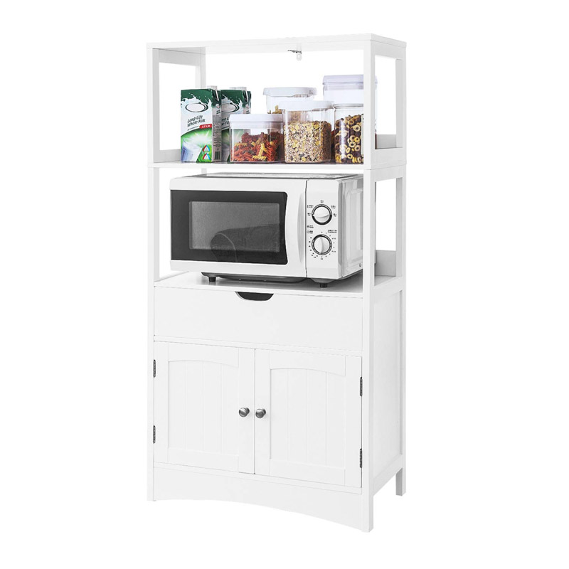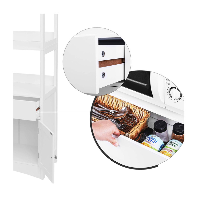 Η ραφιέρα είναι κατασκευασμένη από υψηλής ποιότητας MDF ξύλο καλυμμένο με βερνίκι, ανθεκτική στην υγρασία και με εύκολο καθαρισμό. Διαθέτει 2 ανοιχτά ράφια, 1 ευρύχωρο συρτάρι και 1 μεγάλο ντουλάπι στο κάτω μέρος.