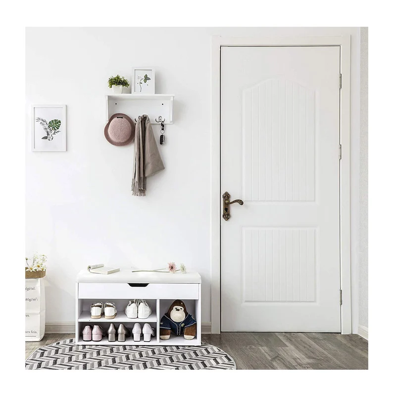 Η παπουτσοθήκη διαθέτει 3 ευρύχωρα ράφια για να αποθηκεύσετε 6 έως 8 ζευγάρια παπούτσια και ένα άνετο κάθισμα με δερμάτινο μαξιλάρι PU σε λευκή απόχρωση. Το επάνω κάλυμμα ανοίγει, έτσι ώστε να είναι δυνατή η αποθήκευση μικρών αντικειμένων, όπως το βερνίκι παπουτσιών, τα κλειδιά ή ακόμη και την ομπρέλα.