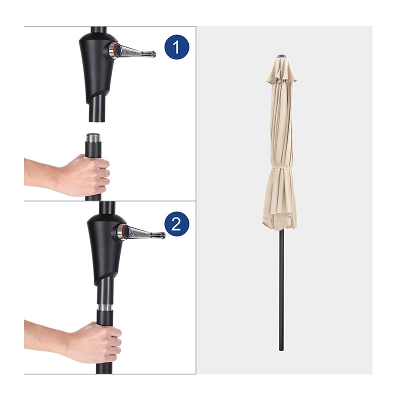 Η ομπρέλα, είναι εξοπλισμένη με μηχανισμό κλίσης, ο οποίος σας επιτρέπει να κάνετε γωνία στον θόλο για να αποκτήσετε τη σκιά που θέλετε, καθώς και με ένα πρακτικό στρόφαλο που της επιτρέπει να ανοίγει και να κλείνει εύκολα. Ο αεραγωγός στην κορυφή διευκολύνει την κυκλοφορία του ανέμου και την διατηρεί σταθερή κατά την παρουσία του. Συνοδεύεται από πρακτική τσάντα μεταφοράς και αποθήκευσης.