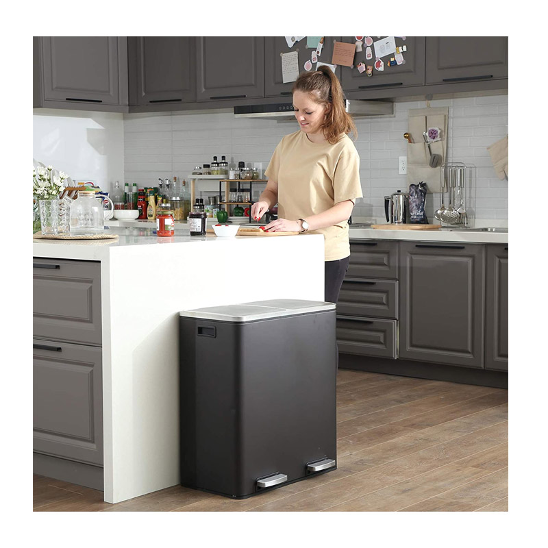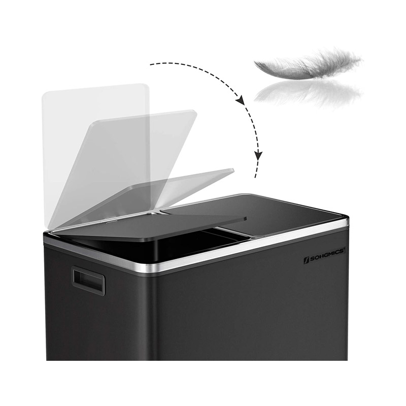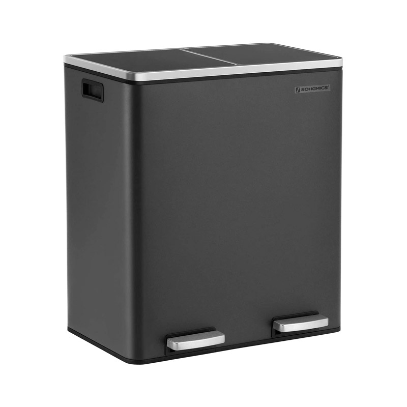 Ο κάδος απορριμμάτων, από την εταιρία Songmics, είναι κατασκευασμένος από ανοξείδωτο ατσάλι με πλαστική βάση. Είναι εξοπλισμένος με 2 αφαιρούμενα πλαστικά διαμερίσματα συνολικής χωρητικότητας 60 Lt (2 x 30 Lt). Είναι εφοδιασμένα με μεταλλικές λαβές μεταφοράς, για να μπορείτε να τα αδειάζετε ξεχωριστά. Επιπρόσθετα, κάθε διαμέρισμα διαθέτει μηχανισμό με αντιολισθητικό πεντάλ, ώστε η απόρριψη των απορριμμάτων να πραγματοποιείται με απολύτως άνετο και υγιεινό τρόπο.